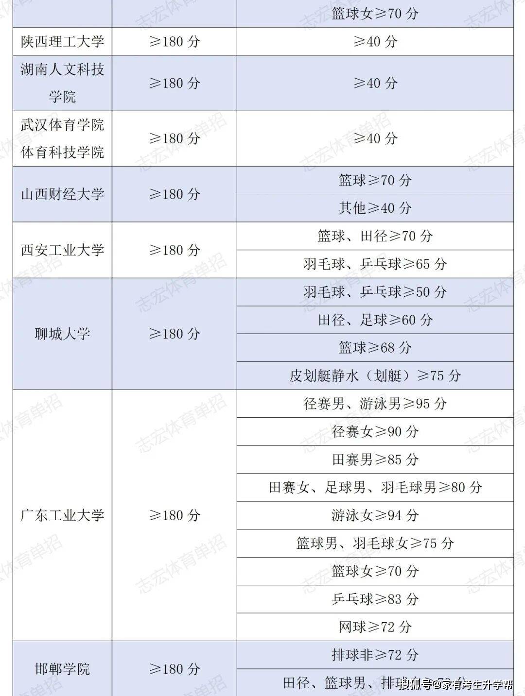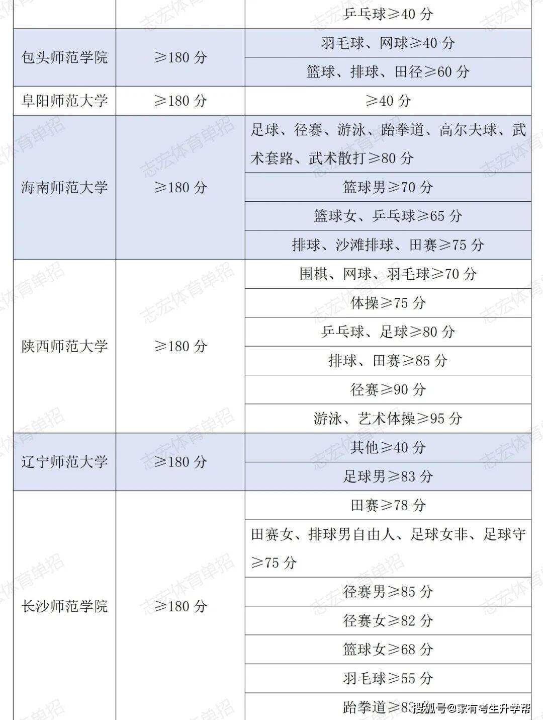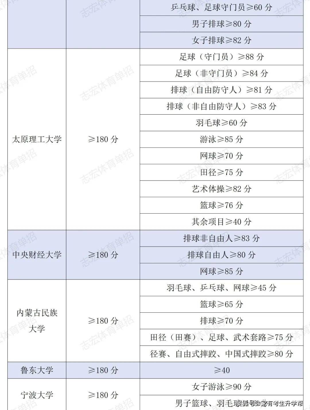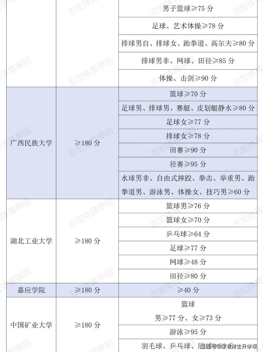 根据体育单招管理办法要求,体育单招录取控制线要求为在文化成绩不低于180分的基础上,在专项成绩不低于40分的基础上,由各招生院校根据本校实际情况综合确定本校文化和专项控制线,并在招生简章中公布。我们根据2026年各院校最新的招生简章统计了189所院校对各项目文化成绩和专项成绩的最低要求。