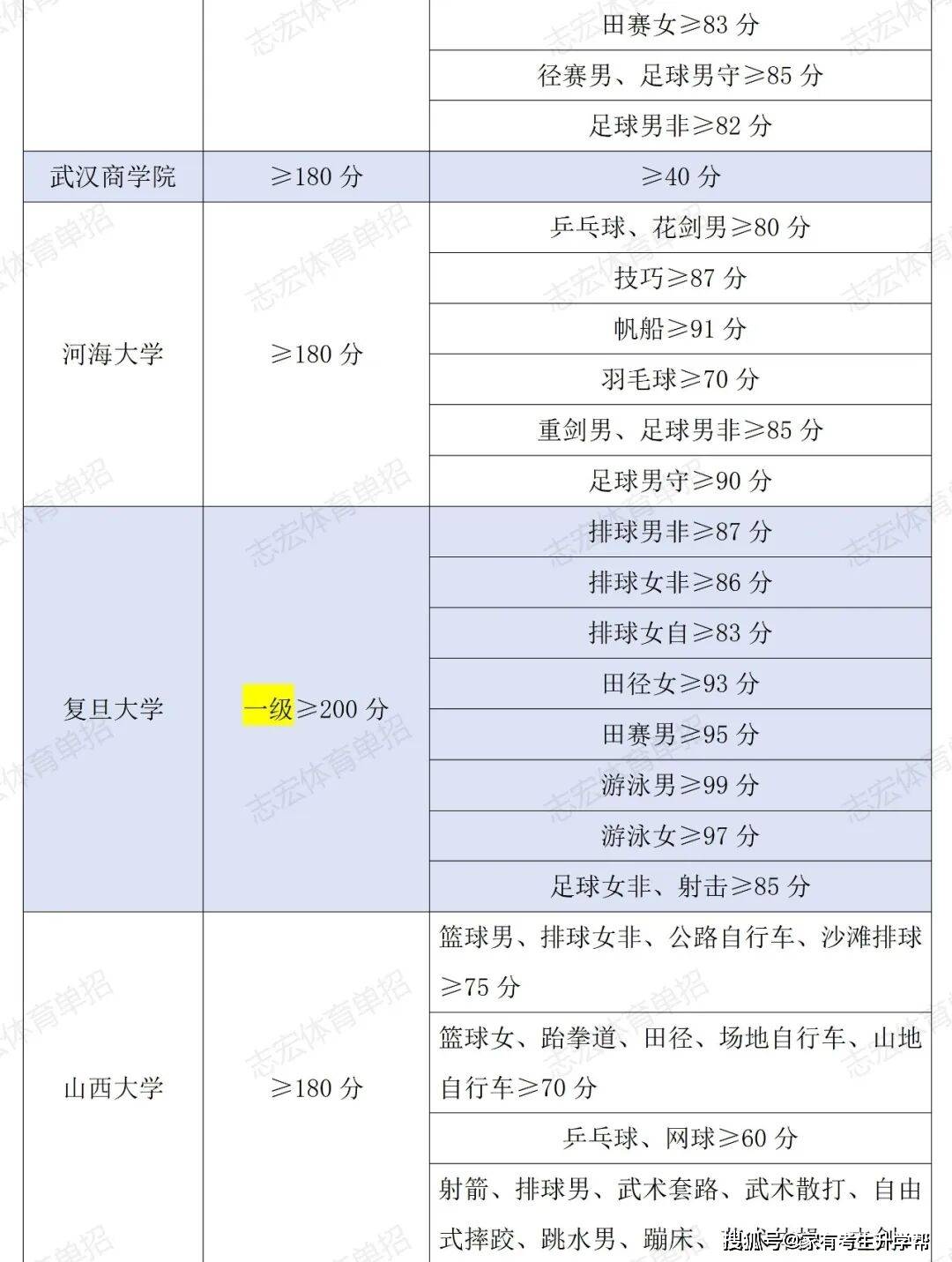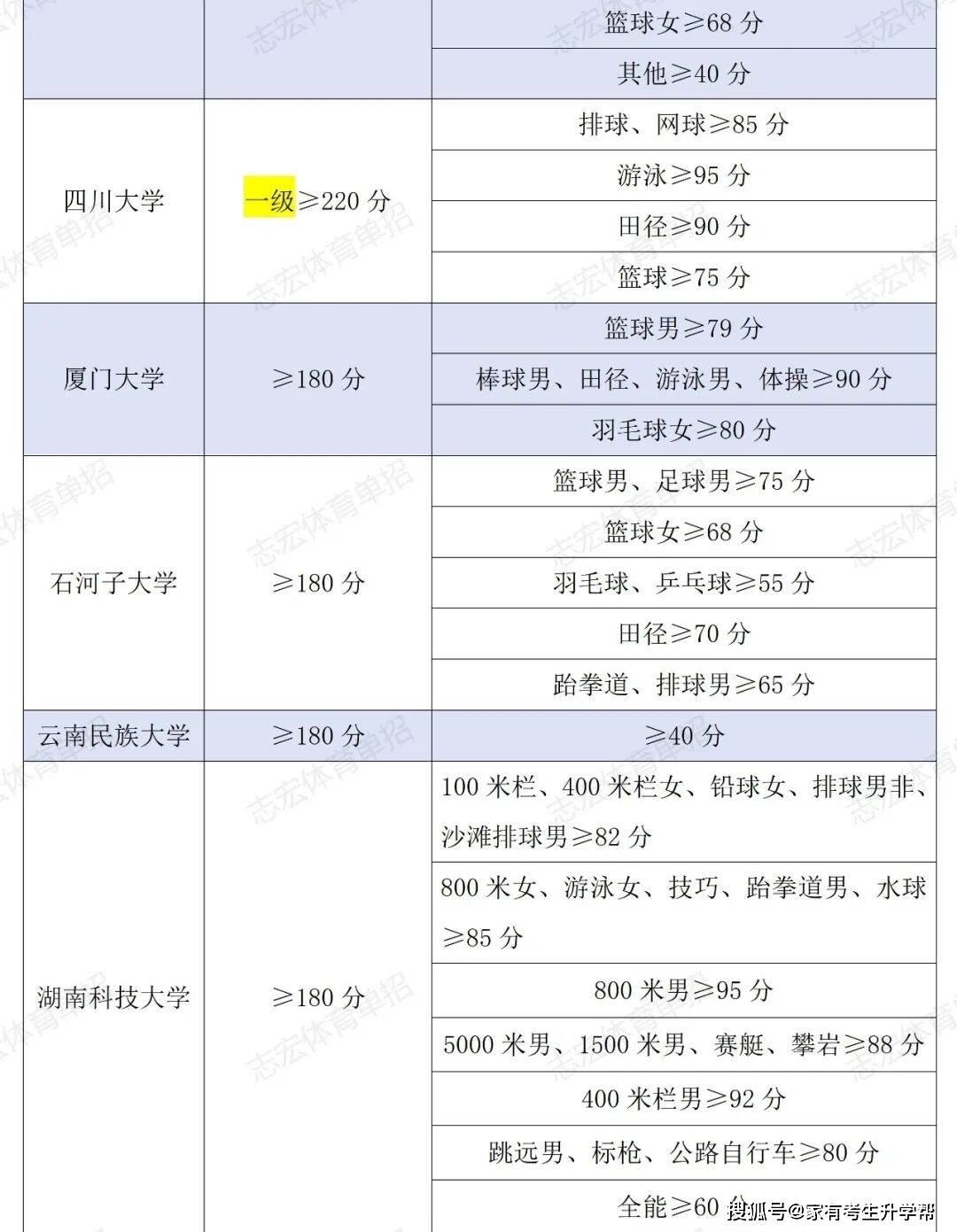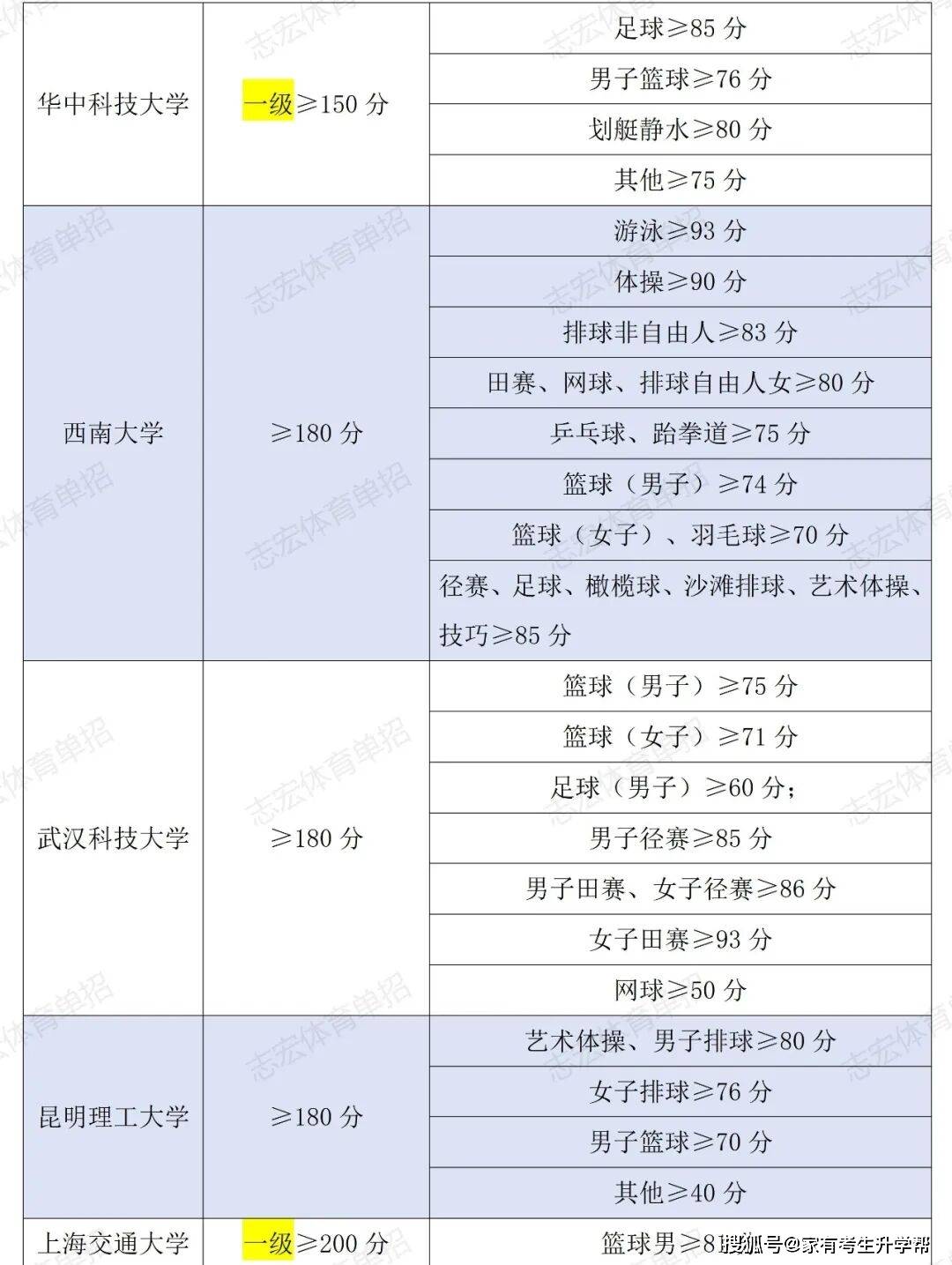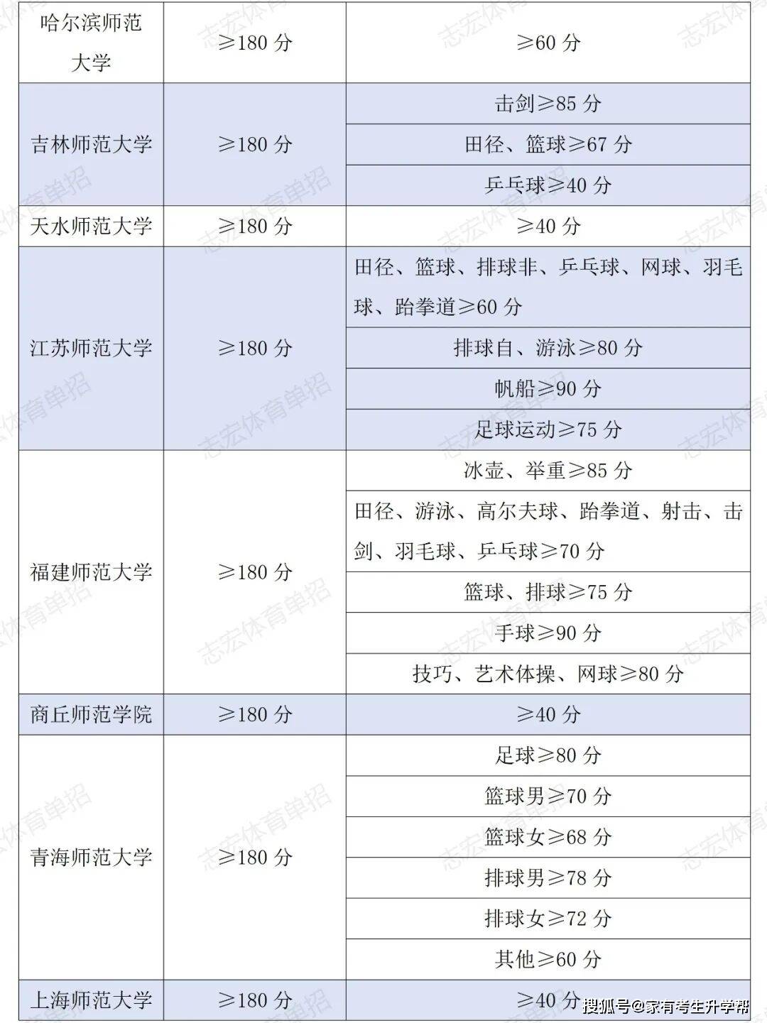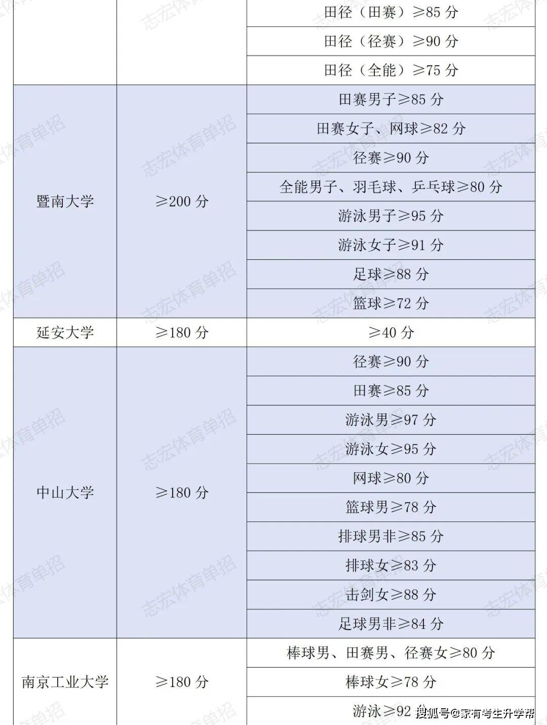根据体育单招管理办法要求,体育单招录取控制线要求为在文化成绩不低于180分的基础上,在专项成绩不低于40分的基础上,由各招生院校根据本校实际情况综合确定本校文化和专项控制线,并在招生简章中公布。我们根据2026年各院校最新的招生简章统计了189所院校对各项目文化成绩和专项成绩的最低要求。