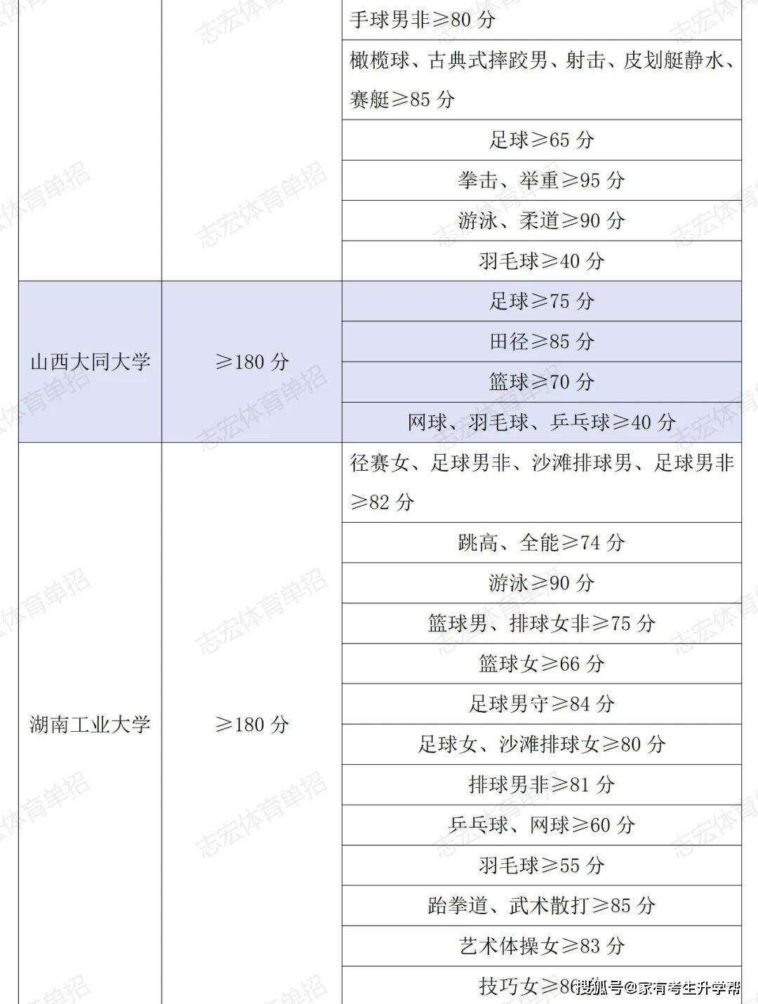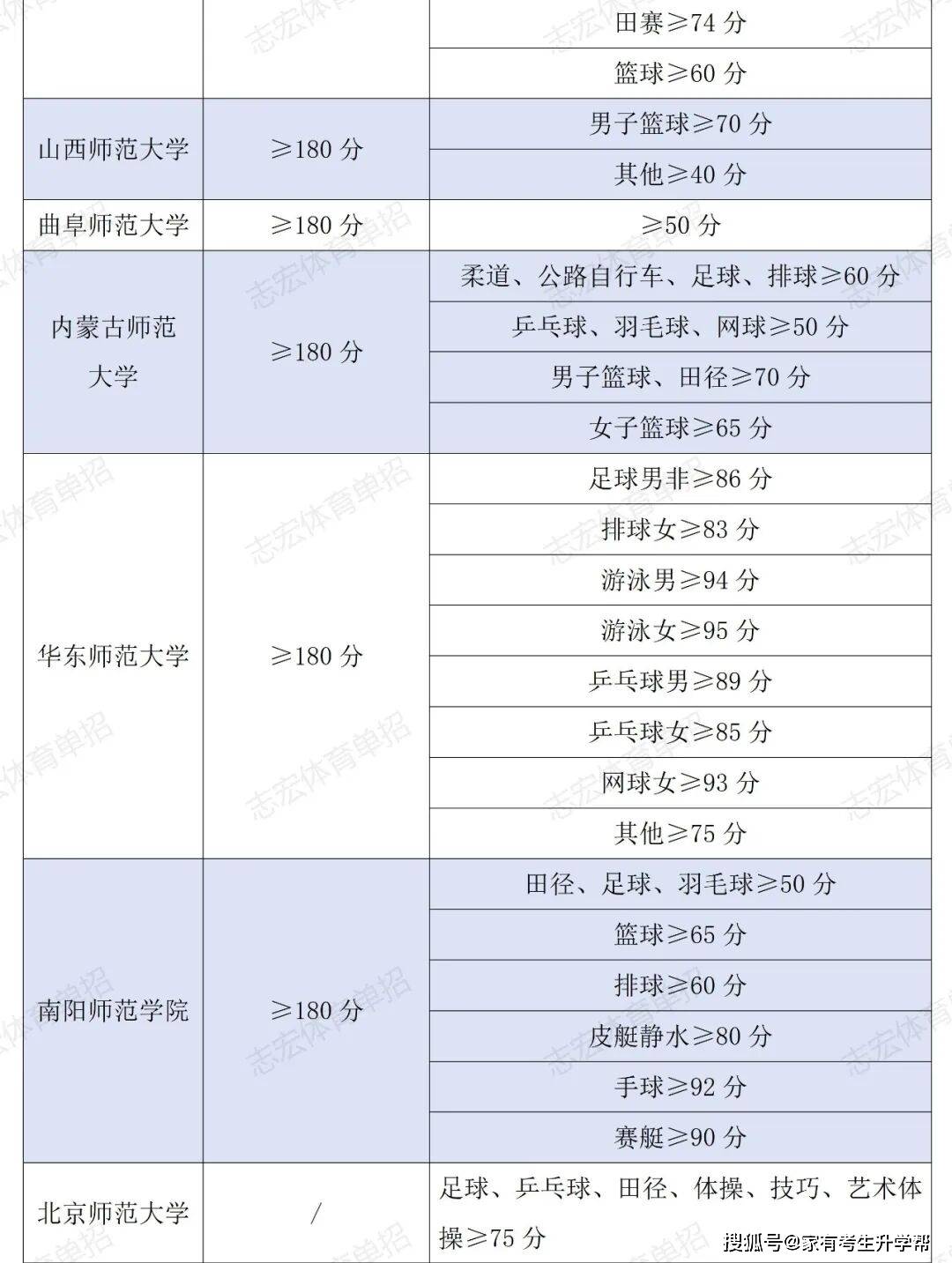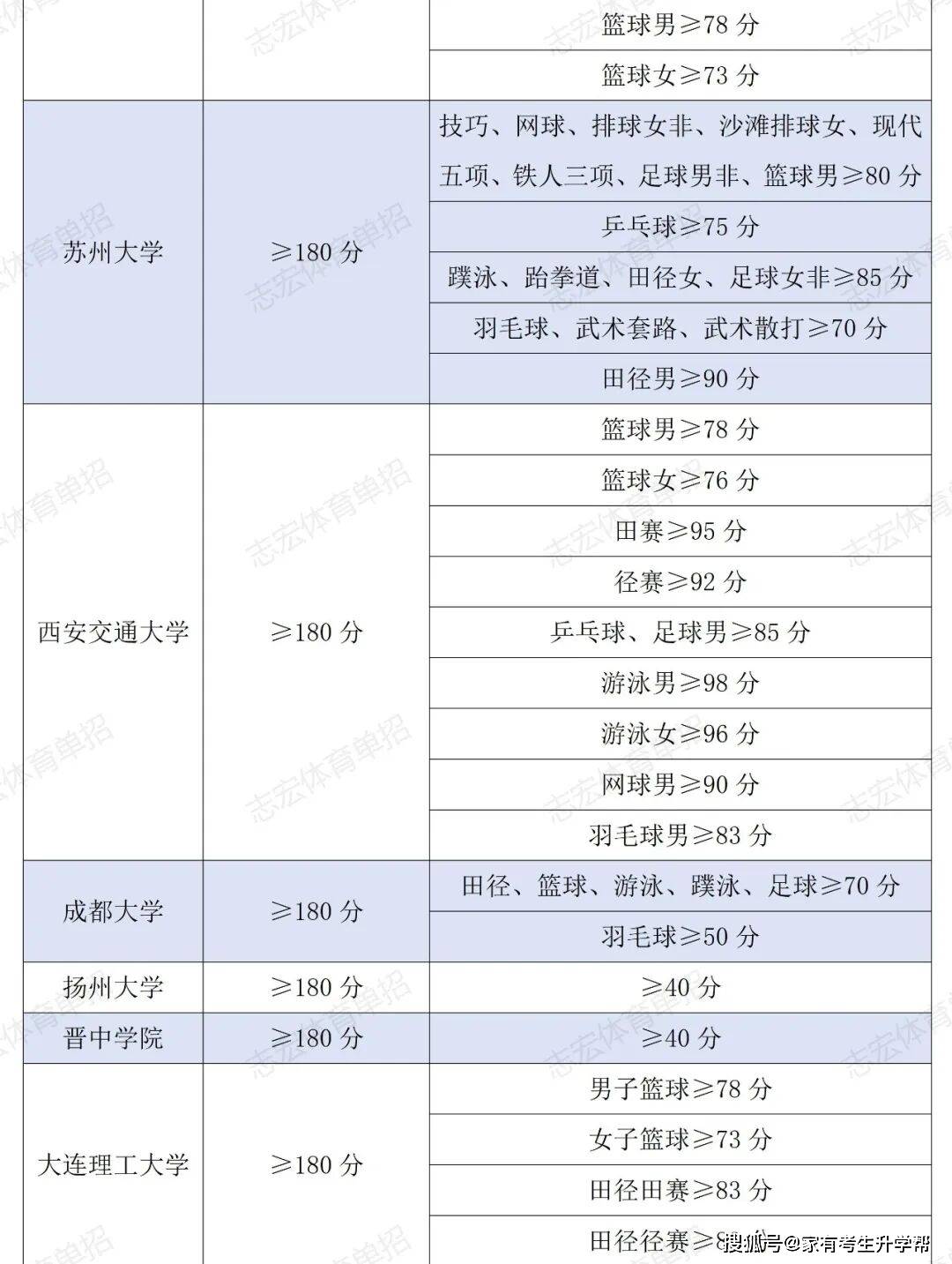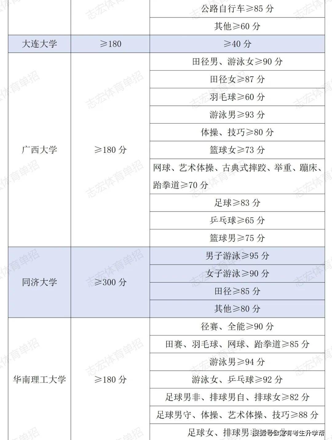 根据体育单招管理办法要求,体育单招录取控制线要求为在文化成绩不低于180分的基础上,在专项成绩不低于40分的基础上,由各招生院校根据本校实际情况综合确定本校文化和专项控制线,并在招生简章中公布。我们根据2026年各院校最新的招生简章统计了189所院校对各项目文化成绩和专项成绩的最低要求。