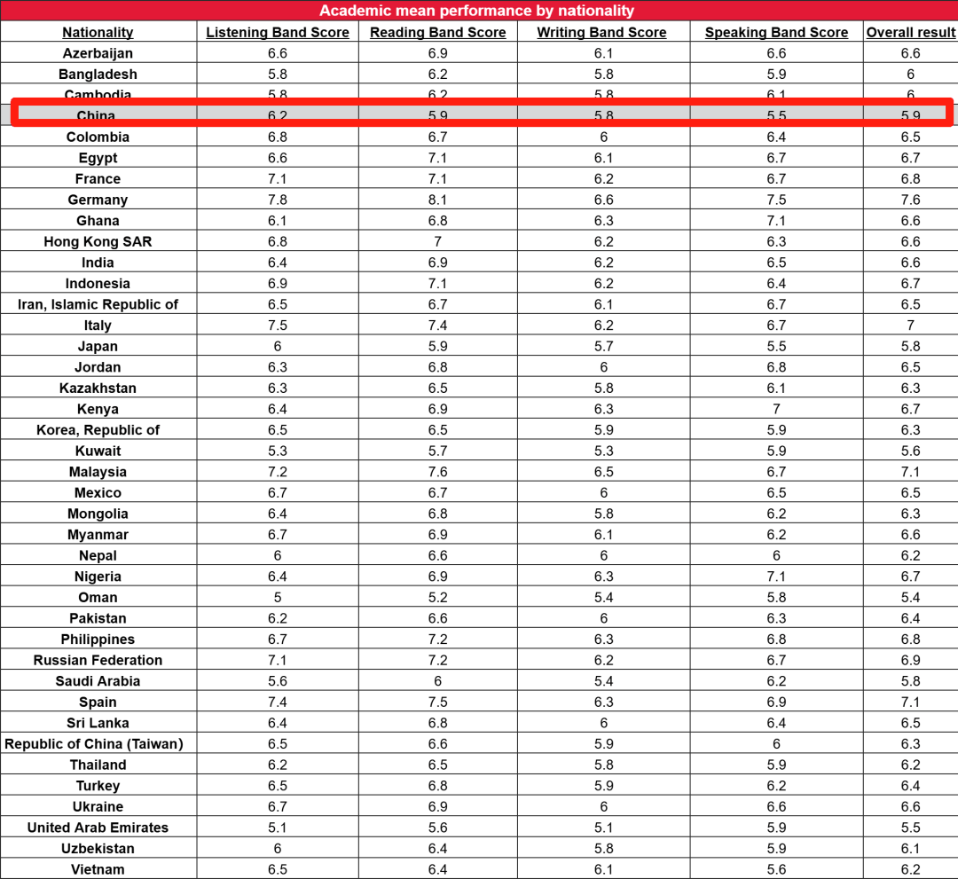 2024-2025全球雅思考生成绩报告显示:中国大陆考生在A类雅思考试中 总分均分仅5.9分;