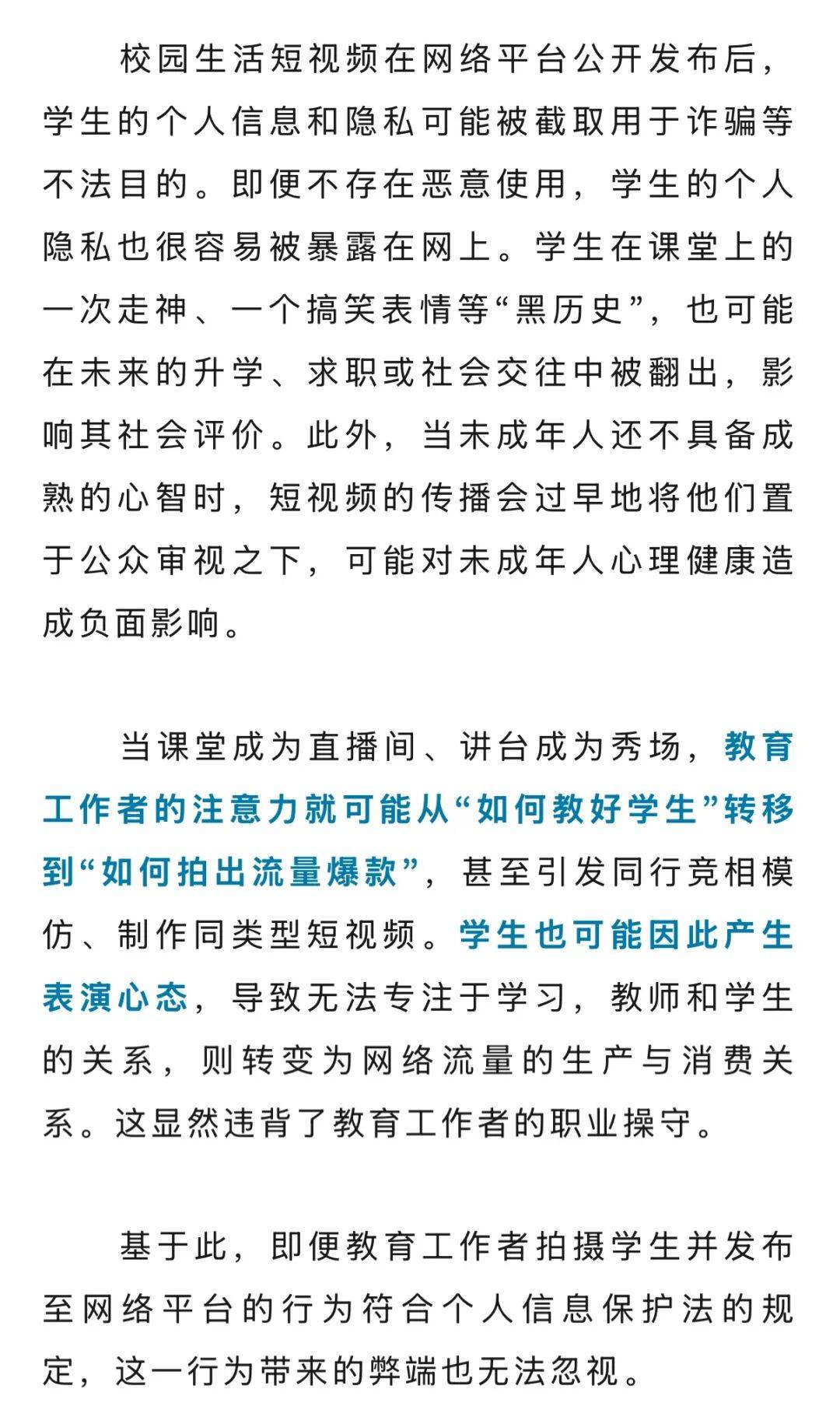 值得注意的是,拍摄者即便取得了学生及监护人的同意,但如果并未清楚地告知视频拍摄的目的与权益保障措施,拍摄和发布在自媒体上的行为也无法满足个人信息保护法“真实、准确、完整”的告知规定,无法被认定为合法使用。