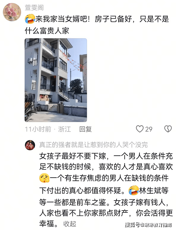 评论区就是最好的证明,视频中出镜的5个小伙子,已经有人被人相中了,有浙江家长直接晒出了豪宅,留言:来我家当女婿吧,也有家长相中了最帅的那个小伙,忍不住开始介绍自己女儿的条件,想撮合这门亲事。