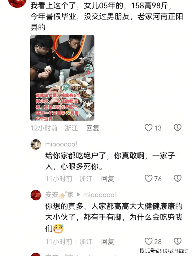 “谁家缺女婿?俺家有6个帅小伙,一个成家的都没有,都是185的大高个,还有一个没回来,有相中的没有?”起初评论区下的留言还很和谐。有网友吐槽:你生6个儿子还敢吃这么好?