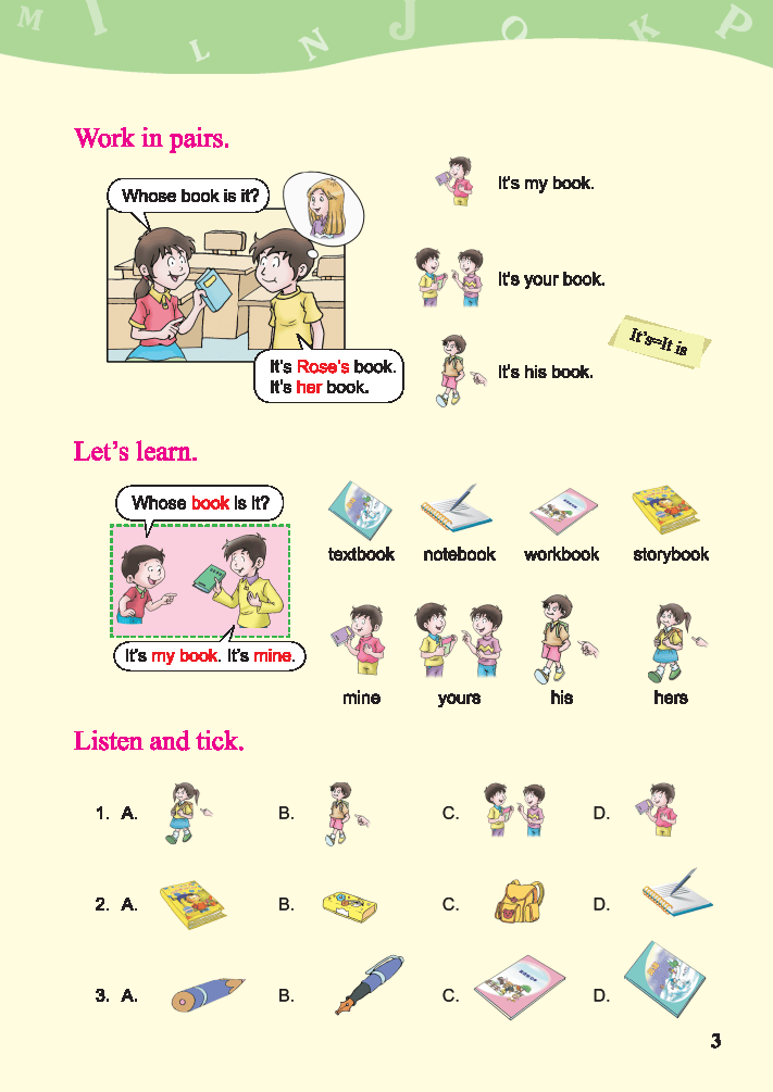 五年级英语进阶关键册!2026秋川教版五年级英语上册新教材是三年级起点的进阶用书,遵循螺旋式上升和生活化导向的理念,贴合五年级学生认知特点,聚焦核心素养培养,共3个单元,每个单元包含3个课时和相关练习模块,围绕喜爱的科目、有趣的课程、幸福的家庭三大核心主题展开,衔接四年级英语基础,兼顾词汇拓展、句型强化和听说读写综合运用,孩子预习复习直接对照,不用费心整理,为后续英语学习筑牢基础。全单元核心知识点精准拆解,适配课堂考点:Unit1围绕喜爱的科目展开,核心是物品归属、课程时间和科目喜好,Lesson1学习物品归属相关词汇,掌握Whose...is it? It's...的核心句型;Lesson2聚焦课程时间,运用I have...on...句型表达某天的课程安排;Lesson3学会用What subject do you like best? I like...best.询问和表达科目喜好,同时渗透基础词汇和句型的灵活运用。Unit2围绕有趣的课程展开,兼顾词汇运用、自然认知和跨文化渗透,Lesson1强化词汇灵活运用,掌握lesson、word等相关词汇;Lesson2聚焦自然认知,学习昆虫相关词汇,能用What is an insect? It has...句型描述昆虫特征;Lesson3了解埃菲尔铁塔等地标知识,掌握Where is...? It's in...的方位表达句型,初步感知跨文化差异。Unit3围绕幸福的家庭展开,核心是家庭场景交际、家庭关系和职业询问,Lesson1学习家庭场景相关表达,掌握Welcome to...的交际句型;Lesson2认识family tree相关词汇,梳理家庭关系;Lesson3学会用What's...job? He/She is a...句型询问和介绍职业,同时规避疑问词辨析、介词使用等易错点,整册教材通过对话、情景任务、趣味练习等形式,让孩子在运用中积累知识、提升综合语言能力。
