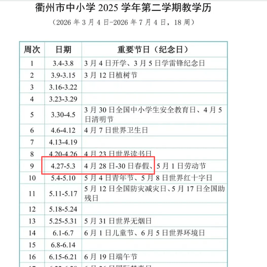 近日,钱塘区2025-2026学年第二学期校历出炉,中小学春假连接五一劳动节假期,再加上调休,一共可以连休10天。