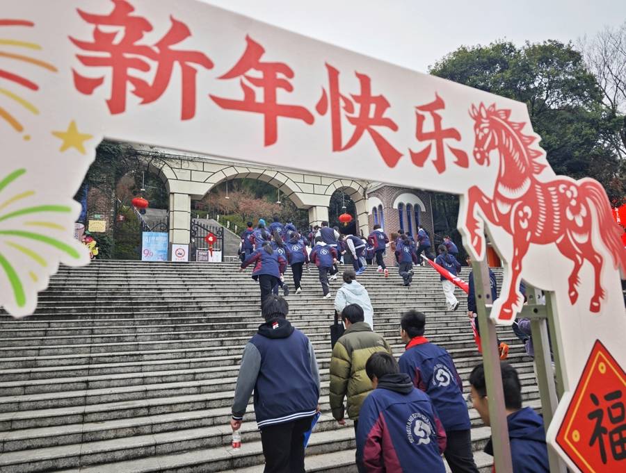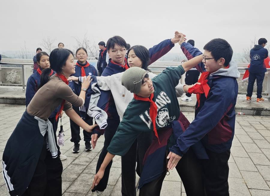 “前几年开学出操,我们发现初三年级不在,就打听到有这个活动,一直很期待,今年终于到我们了!”男生小陈想了一想,用两个字形容这种“仪式感”。“传承!”政教处主任袁宇飞介绍,学校已经连续4年组织这个活动,今年恰逢红军长征胜利90周年,因此,老师们特意设计了背诵《七律·长征》、长征知识问答、合作拼搭“人形五角星”等三个打卡任务,同学们须在登山过程中以小组为单位完成,也让大家感受到,登山虽然辛苦,但一路有伙伴同行。