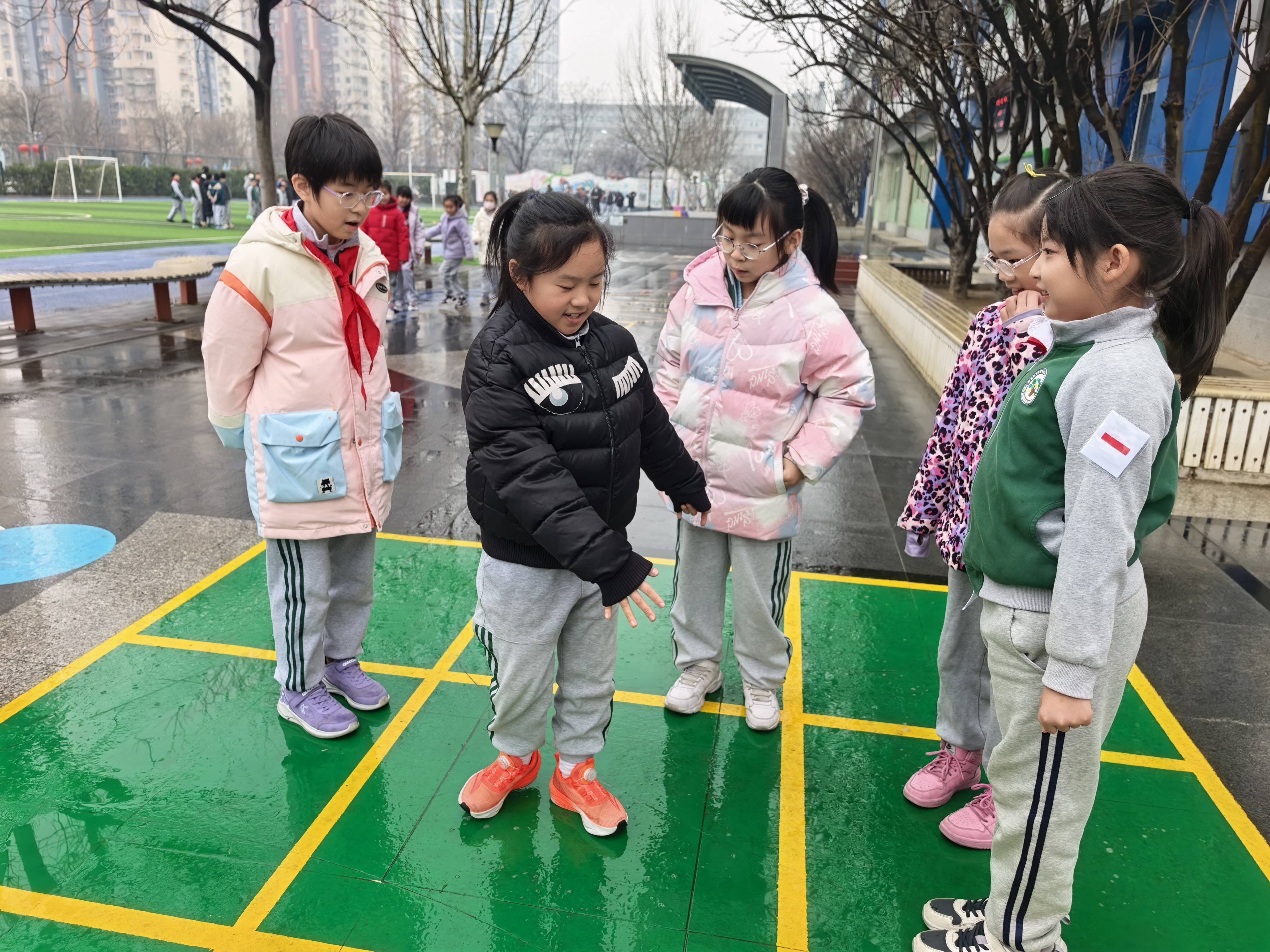 “3”即3个一刻钟小课间微运动。体育团队充分解锁教学楼内、外等多元空间,精心开发地面体育游戏,将体育锻炼与数学、英语等学科深度融合,打造跨学科、趣味化、可参与的运动场景,同时鼓励学生自主创编游戏、自由舒展活动,真正实现“时时可运动、处处能健身”。