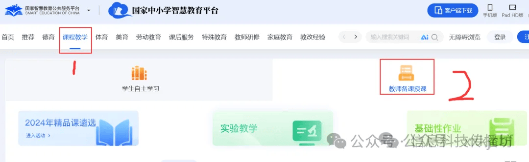 第二步:登录「智慧教育平台」,进入平台后完成账号登录。在平台点击「课程教学」-「教师授课」,通过「切换教材」筛选学段、学科和版本,找到你想要下载的课。