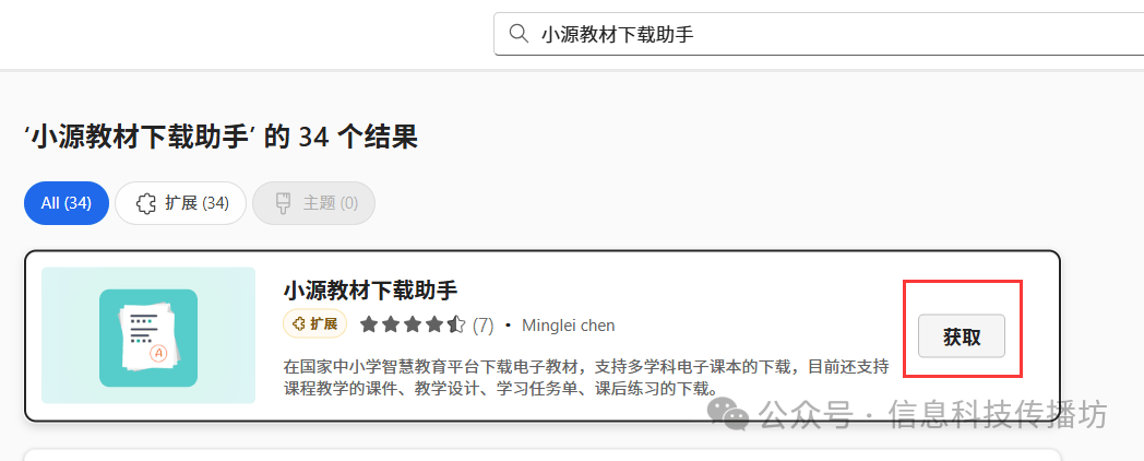 第一步:打开 Edge 浏览器,依次点击「扩展」-「获取 Microsoft Edge 扩展」,搜索 “小源教材下载助手” 完成安装。