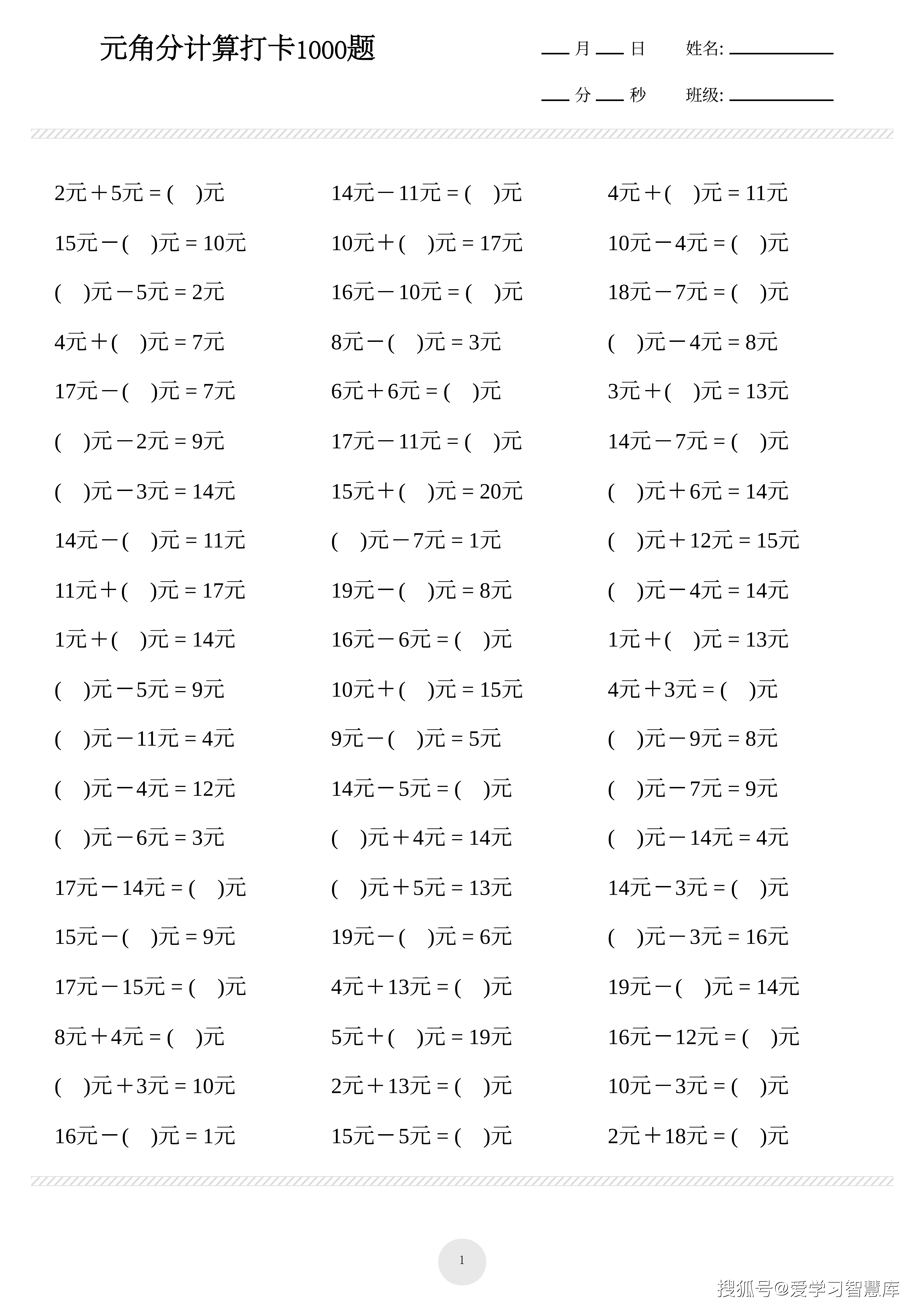 一年级下册数学元角分计算专项练习1000题(电子版可打印)