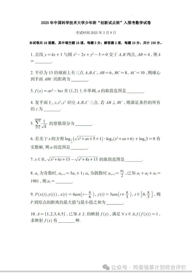 中国科学技术大学创新班入围考数学物理真题