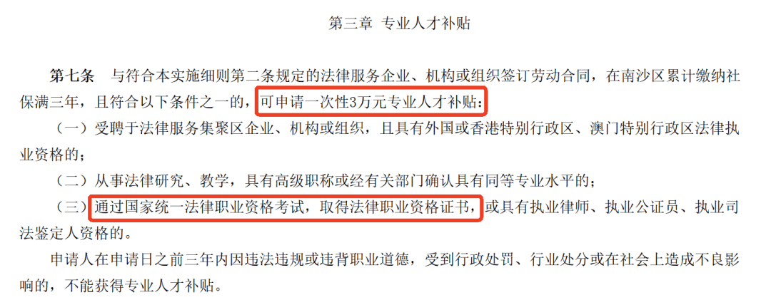 内容提到:与符合本实施细则第二条规定的法律服务企业、机构或组织签订劳动合同,在南沙区累计缴纳社保满三年,且符合以下条件之一的,可申请一次性3万元专业人才补贴: