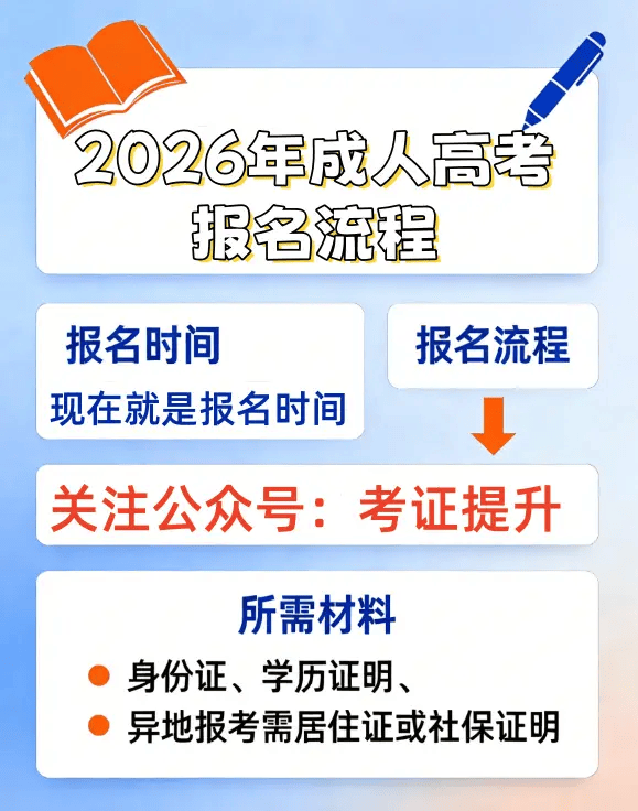 2026 年成人高考现在就是报名时间,分网上注册、资料提交、审核缴费等阶段。本次报名全程采用线上方式,考生需登录考试院官网完成信息填报、志愿选择及材料上传,审核不通过者需按要求补正,完成缴费后才算报名成功。成人高考一年仅一次报名机会,无补报通道,考生需提前备好身份证、学历证明等材料,避开系统高峰错峰报名,同时密切关注官方公告,避免错过时间影响报考。社会考生不清楚流程可以关注公众号:考证提升