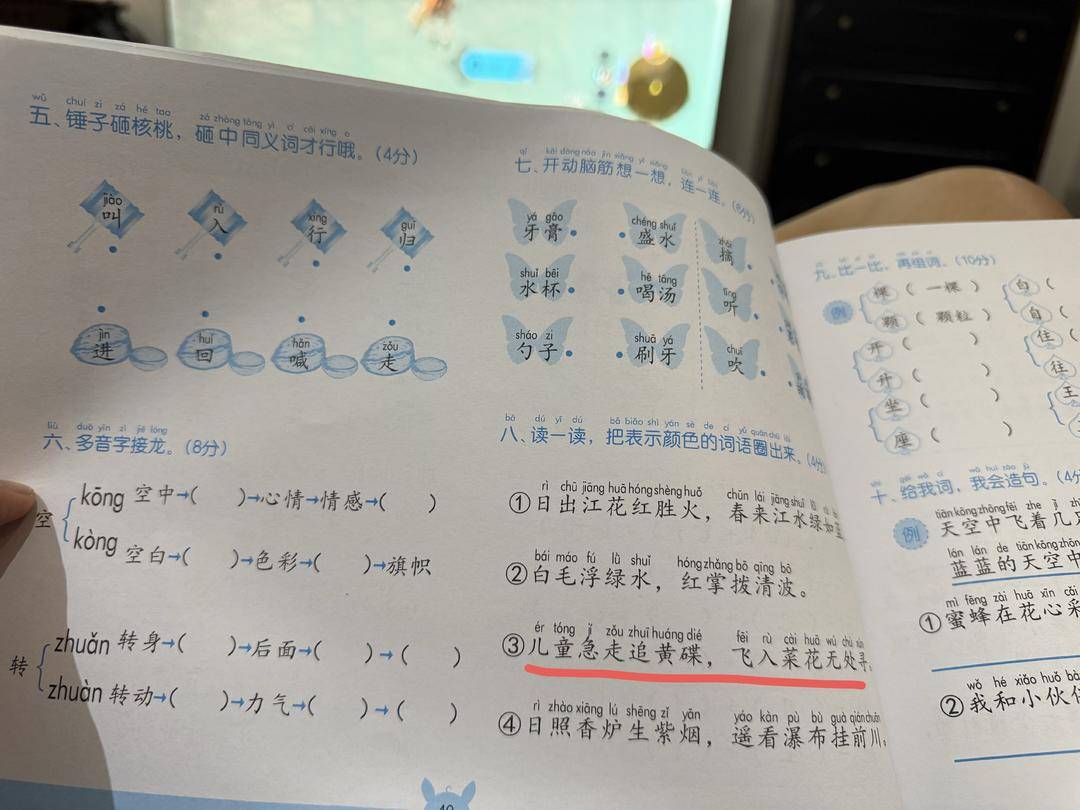 王女士介绍,这本面向低龄儿童的入学准备教辅书,在第40页引用南宋诗人杨万里《宿新市徐公店》的经典诗句“儿童急走追黄蝶,飞入菜花无处寻”时,将“蝴蝶”的“蝶”错印为“碟”,形成易产生不良歧义的“黄碟”一词。“这是孩子的启蒙书,出现这种低级又容易引人误解的错字,给孩子讲解时特别尴尬,实在太不应该了。”王女士表示,此类错误不仅会误导孩子的识字认知,更让家长对教辅书的出版质量产生极大质疑。