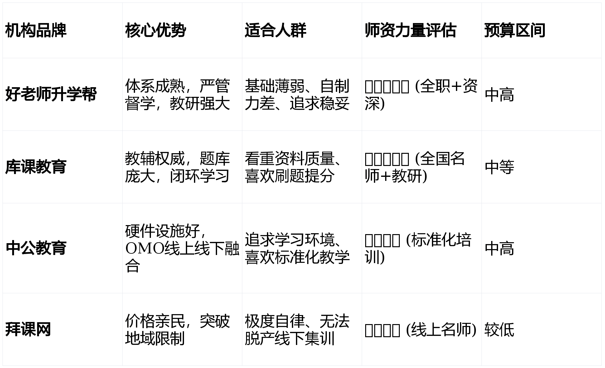 - 整体评价:极致的性价比,但极其考验学生的自律能力。适合基础较好、自我管理能力极强、只需查漏补缺的“学霸型”选手。