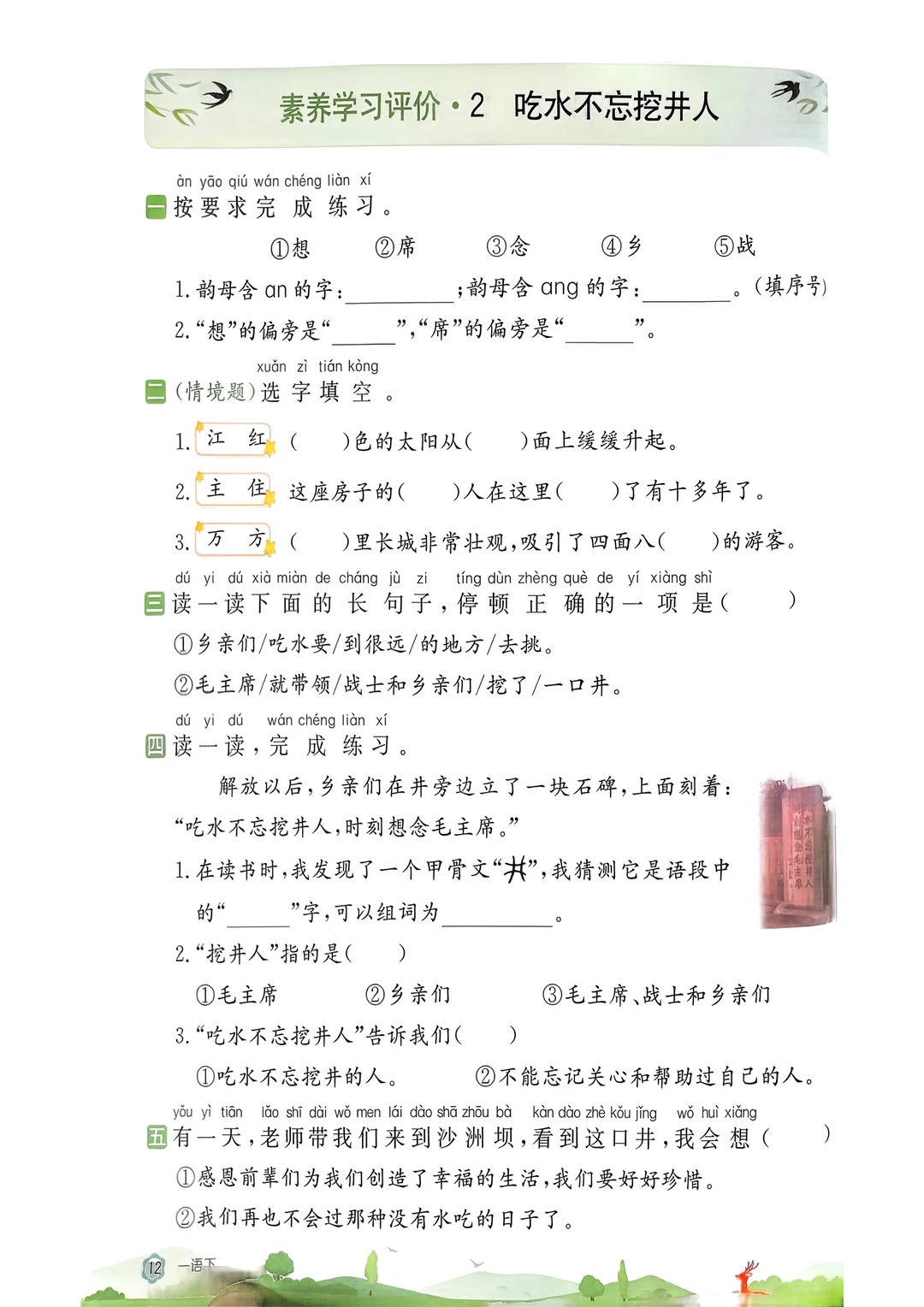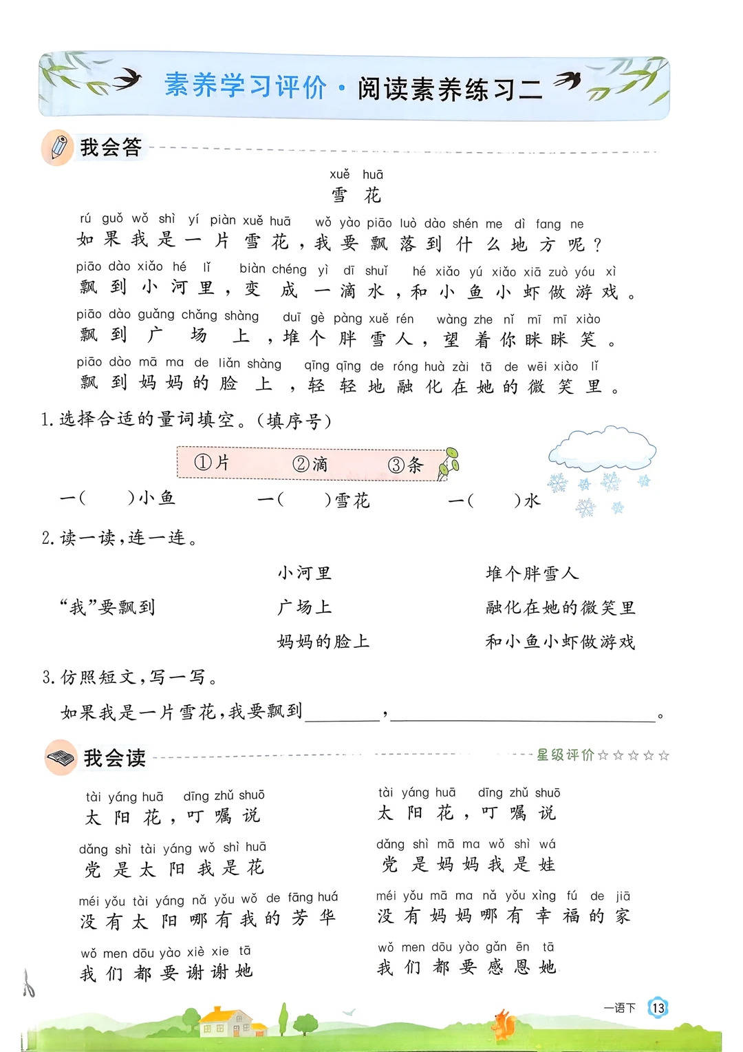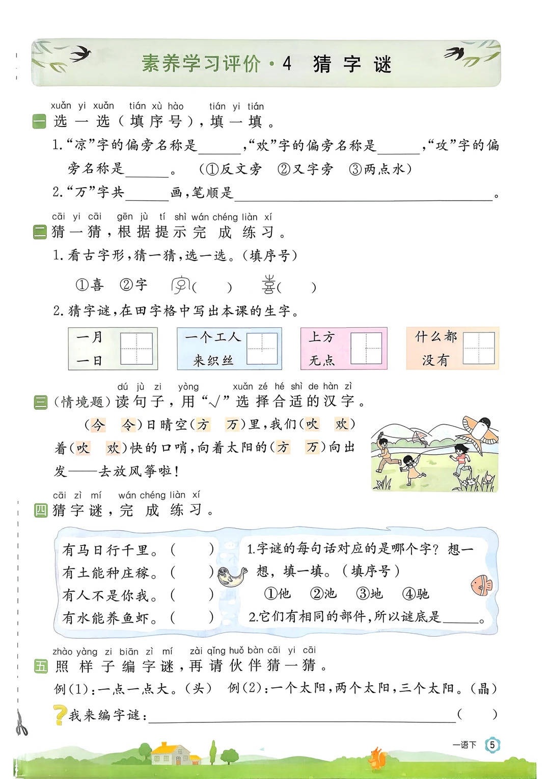 首先,夯实核心基础,扫清识字写字易错点。一年级下册的核心任务是累计识字、规范书写,这份资料通过针对性训练,彻底解决孩子 “读错音、写错字、用错词” 的问题。比如《春夏秋冬》中,精准辨析 “落 (nuò)” 的错误读音,通过 “雨字头” 偏旁归类,让孩子理解 “霜、雪” 与水和天气的关联;《小青蛙》一课,聚焦 “青” 字族形声字规律,通过加偏旁变新字的练习,帮孩子举一反三掌握识字方法,告别死记硬背,高效完成识字目标。