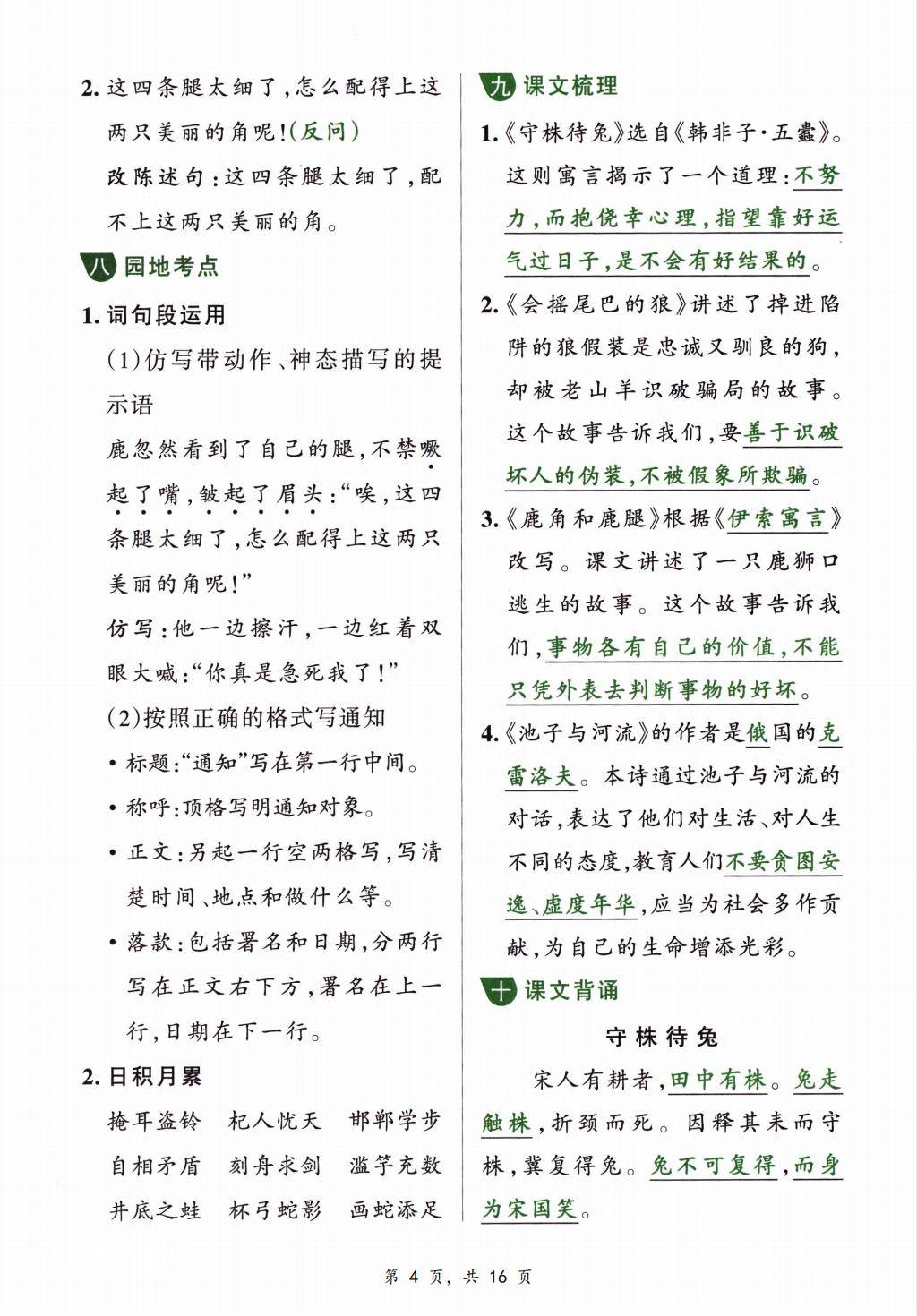 聚焦寓言故事,字词和寓意理解并重。易错字音如 “希冀(jì)”“犹豫(yù)”“遵循(xún)”,多音字如 “为、模、相、称、撒”,易混字形如 “释、尘、配” 需重点区分。词语积累包括出自寓言的成语,如 “守株待兔、南辕北辙、叶公好龙”,以及 AABC、无 × 无 × 式词语。课文梳理部分,《守株待兔》《鹿角和鹿腿》《池子与河流》等寓言的寓意是考点,需明确 “不努力靠运气没有好结果”“事物各有价值”“不要贪图安逸” 等道理,同时掌握反问句改陈述句、写通知等语文园地考点。