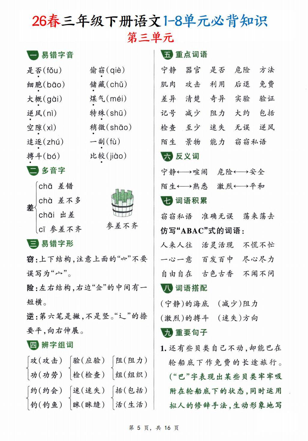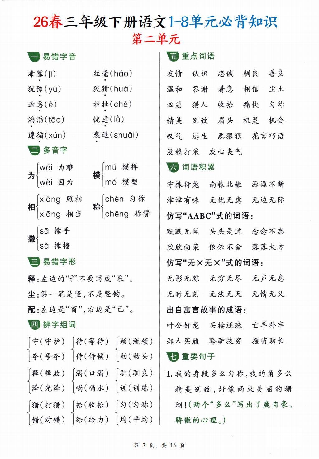 三年级下册语文知识点多且零散,这份 1-8 单元必背知识清单按单元划分,把字词、课文、考点都梳理得清晰有条理,孩子复习起来更有方向,基础和重点内容都能兼顾到。