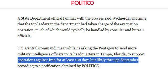 一份通知文件显示:“美军中央司令部正在敦促五角大楼为其在佛罗里达州坦帕市的总部派遣更多军事情报人员,以支持美军对伊朗军事行动持续至少100天甚至到9月。”