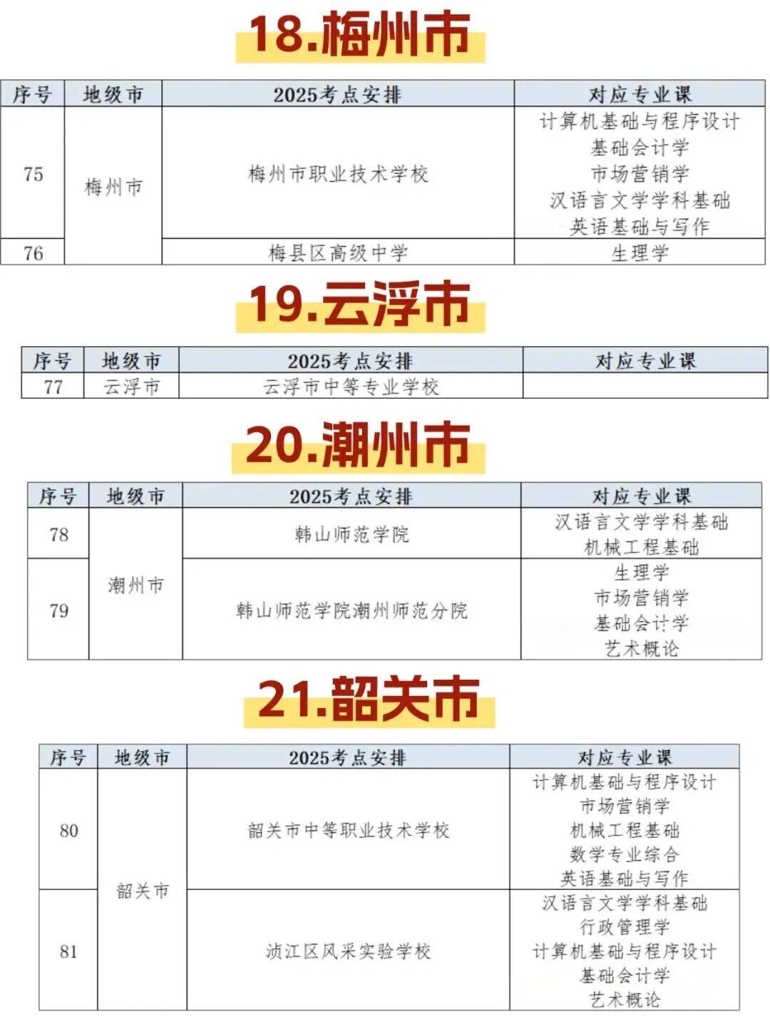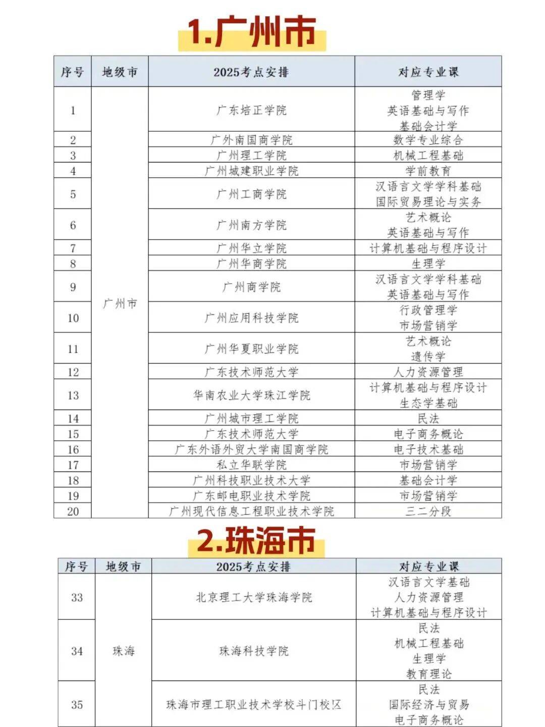省统考科目的考试地点前面提到了,考生可以自由选定考点所在的地市,广东省有21个地级市。而校考一般是由招生院校自主安排的,大概率会在本校。