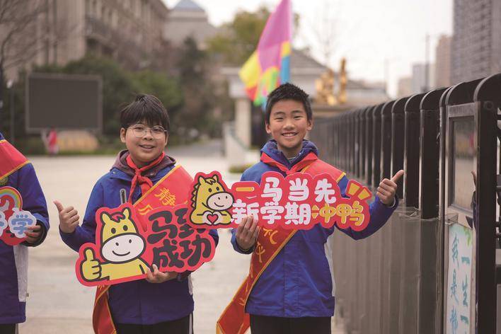 校门口,“再启新程” 的红色拱门格外醒目;签名墙上,孩子们一笔一画写下成长心愿,为马年新学期打卡 “第一签”;幼儿园里,萌娃身着喜庆服饰,在 “我是大玩家” 主题布景前定格童真,“马年大吉” 的祝福装点着校园各处。操场上,“秀娃” 们手持写有 “马到成功”“前程似锦” 的吉祥卡片,与 “马上有福” 福字墙合影,灿烂笑容在脸上绽放。课堂外,孩子们围坐桌前体验非遗糖画,灵动的骏马图案在糖丝间缓缓成形,传统年味与校园朝气撞了个满怀。