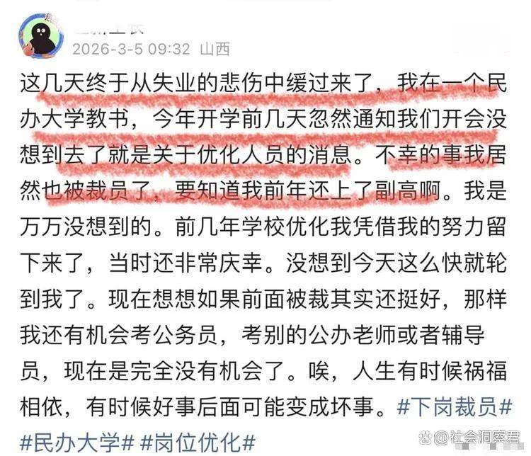 3月5日有山西网友发帖,这几天终于从失业的悲伤中缓过来了,我在一个民办大学教书,今年开学前几天忽然通知我们开会没想到去了就是关于优化人员的消息。不幸的事我居然也被裁员了,要知道我前年还上了副高啊。我是万万没想到的。前几年学校优化我凭借我的努力留下来了,当时还非常庆幸。没想到今天这么快就轮到我了。