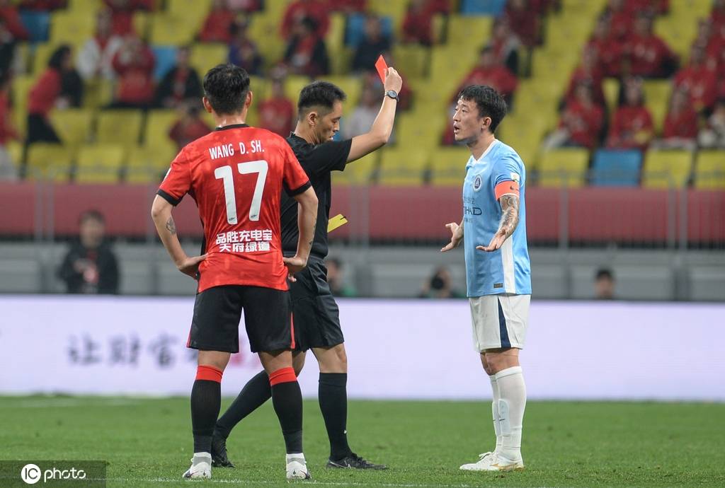 第15分钟,席尔瓦在中场右边路准备突破时,姜至鹏直接右肘肘击对方面部,席尔瓦嘴部出血。王迪在第一时间黄牌警告后,经由VAR回看取消黄牌,直接红牌将姜至鹏驱逐出场,队长袖标戴到了韦斯利胳膊上。姜至鹏在离场之前还在场边关切了席尔瓦的伤情。