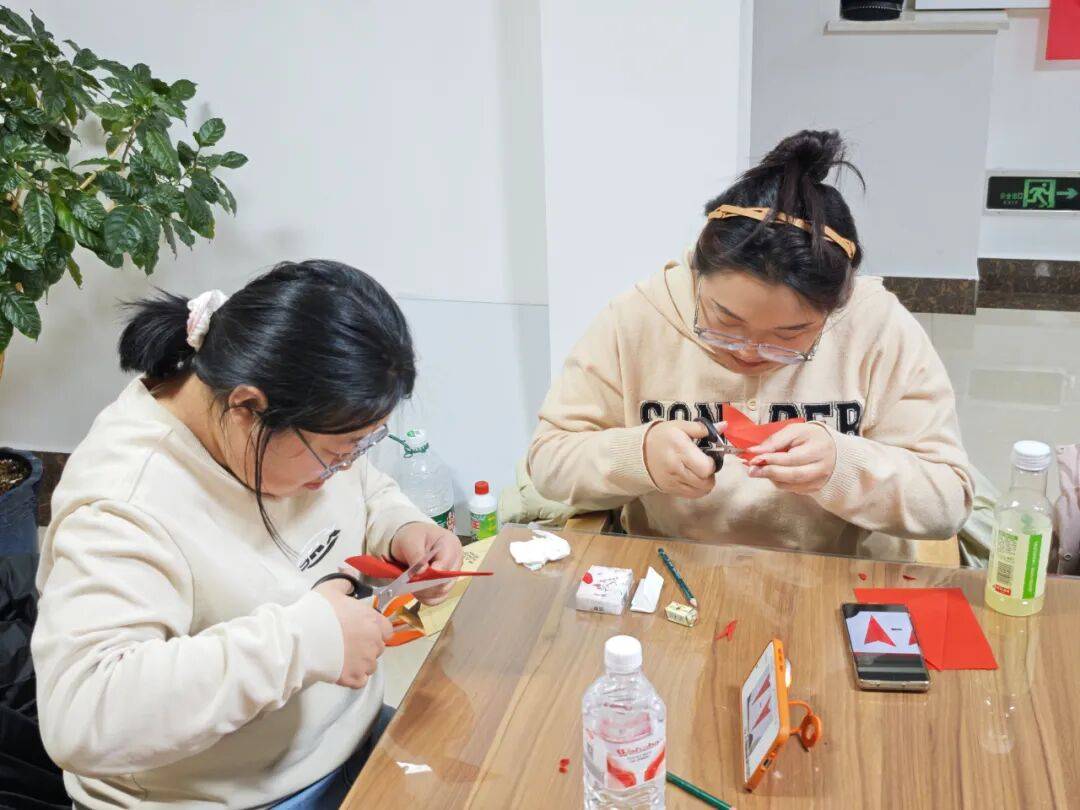 本次体验课特邀伊春开放大学老年教育部教师杨思涵授课,课堂上老师围绕剪纸历史文化、艺术特点、民俗寓意与基础技法展开讲解,通过现场示范、手把手教学,向学员传授折叠、裁剪、修边等实用技巧,带领大家感受非遗剪纸的独特魅力。课程期间,青年们热情高涨、兴致盎然,认真聆听讲解、仔细观摩示范,很快便投入到剪纸创作中。一张张大红宣纸在手中对折、勾勒、裁剪,剪刀开合间,纸屑纷飞,原本普通的纸片,在青年们的巧手下渐渐变成了造型各异、寓意美好的作品。大家在一刀一剪间感受传统技艺的精妙,在轻松温馨的夜间氛围中舒缓压力、陶冶情操。