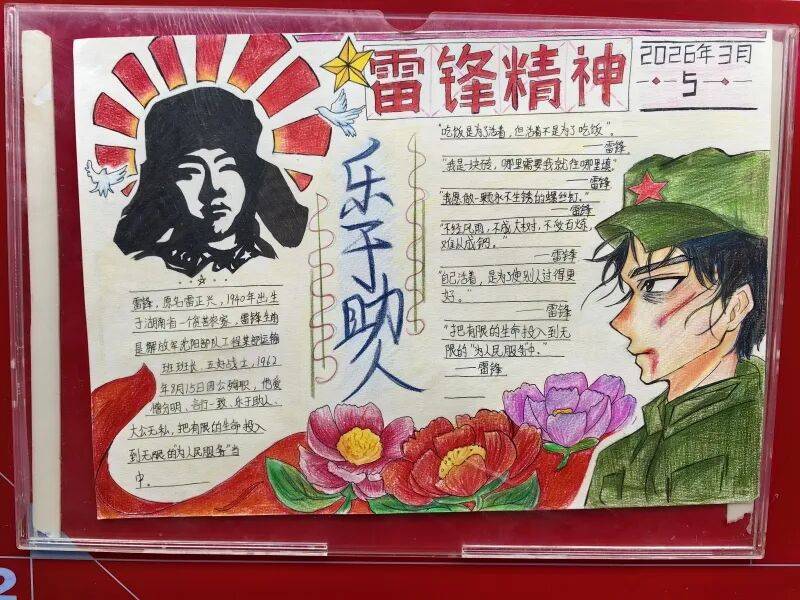 画笔绘真情,文字表心声。学校组织开展了“我心中的雷锋”主题手抄报、黑板报创作活动。同学们踊跃参与,用手中的画笔描绘雷锋形象,用真挚的文字表达对雷锋的敬意。一幅精美的手抄报,一期精心设计的黑板报,或讲述雷锋故事,或摘录雷锋名言,或表达学习决心,主题鲜明、内容丰富、形式多样。优秀作品在宣传栏集中展出,成为校园里一道亮丽的风景线。课余时间,同学们驻足欣赏,在笔墨丹青中感受雷锋精神的永恒魅力。