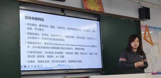 张芳、陈小霞老师分别结合2024-2025 年高考英语真题及命题趋势,从命题特征、题型解析、备考实施三方面展开深度分享新高考英语命题始终坚守结构稳定、素养导向的核心原则,题型与分值保持固定,全面考查学生的语言能力、文化意识、思维品质与学习能力。2024 年真题聚焦人与自我、人与社会、人与自然三大主题语境,将五育融合、立德树人贯穿全卷,语法填空等题型更是融入丝绸之路、中西方文化交流等元素,实现语言学习与价值引领的统一;2025 年真题则进一步呈现语篇权威化、学术化特征,《国家地理》《经济学人》等外刊语篇占比超 60%,科技与社会议题显著增加。同时,高考对思维层级的考查持续提升,2024 卷基于 SOLO 理论的高阶思维考查分值占比超 80%,价值考查形成文化自信与全球视野双轮驱动,中国元素与碳排放、AI 等全球议题并重,写作板块则坚决反模板、反套作,强调真实情境下的逻辑与表达