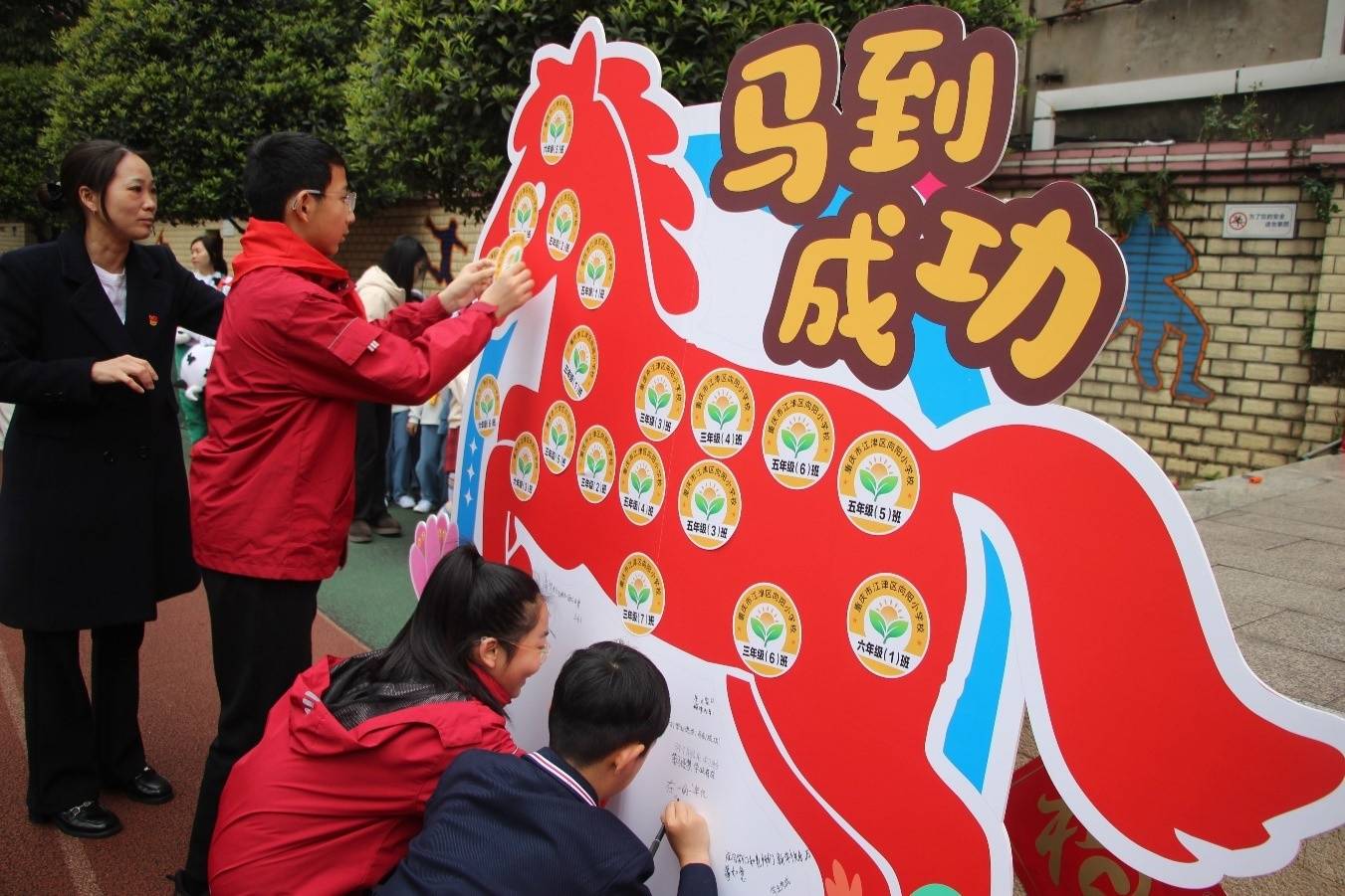学校相关负责人为各班颁发智慧校徽与春芽徽章,鼓励学生们争做智慧、自信、向上的新时代好少年。各班学生代表在“马到成功”心愿墙上写下新学期目标与心愿,一笔一画承载着少年理想,一字一句凝聚着成长力量,在春日校园里种下希望的种子。