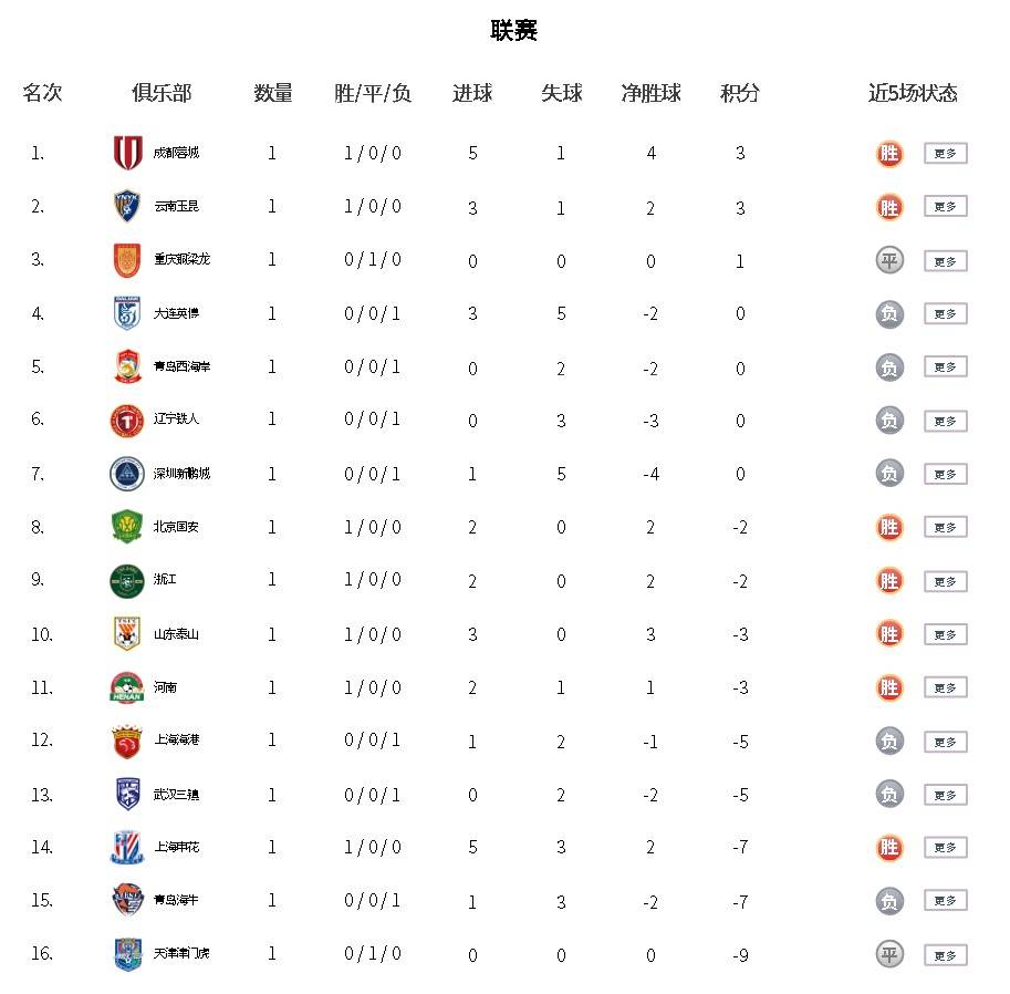 北京时间3月8日,2026赛季中超联赛首轮战罢,积分榜新鲜出炉。成都蓉城5-1大胜青岛海牛,占据榜首;上海申花5-3大连英博,摆脱副班长。山东泰山、北京国安、浙江队、云南玉昆也都取胜,上海海港遭遇开门黑。