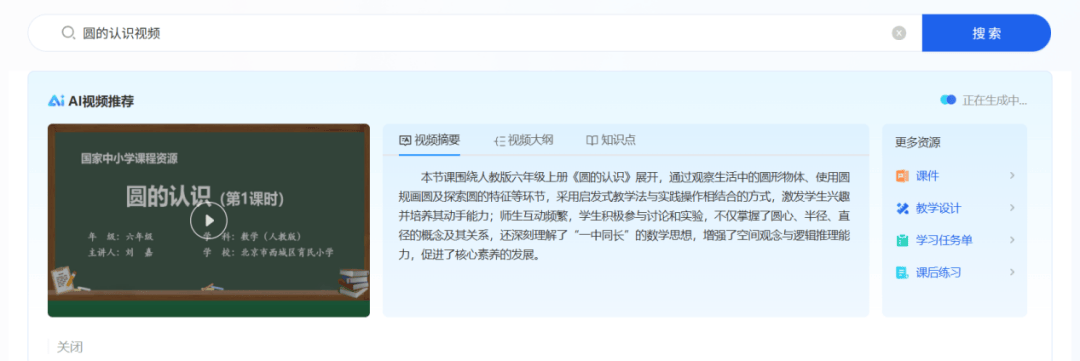 教学设计初步定稿后,教师可继续搜索《圆的认识》相关视频,在AI推荐的视频右侧会出现当前视频的视频摘要、视频大纲和关键知识点标签。教师可在较短时间内快速浏览,并精准判断视频内容与教学环节的匹配度,选择与教学最匹配的名师微课、实验演示等视频资源,一键存入资源库,极大提升了视频资源的筛选和利用效率。