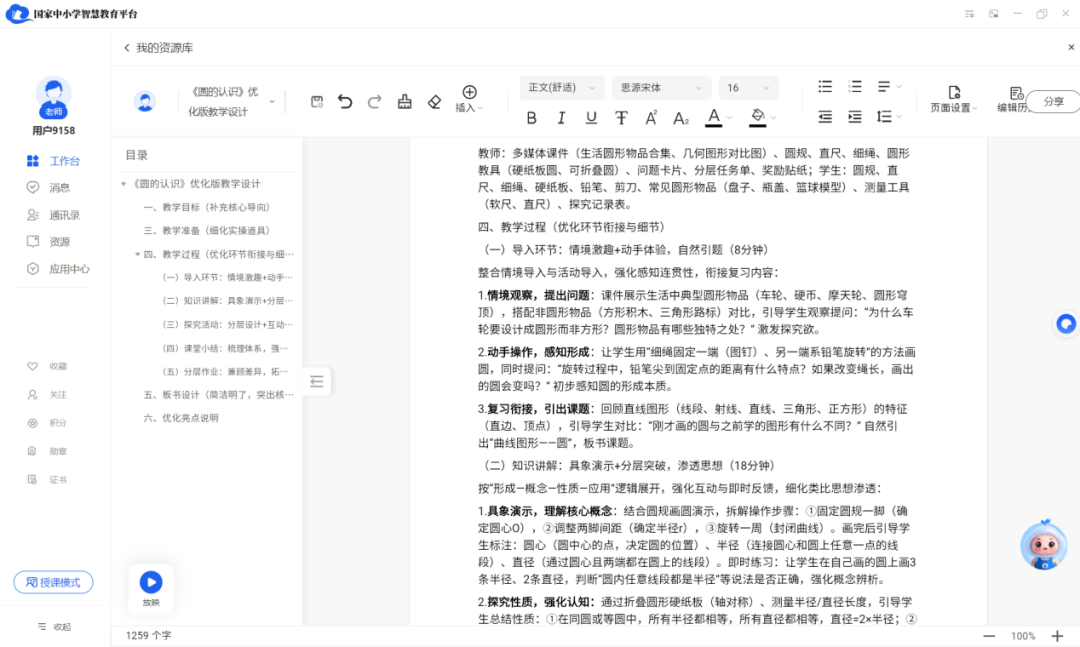 由国平台AI生成的教学建议可直接存入教师个人备课资源库,作为备课的优质起点,教师可使用平台编辑功能,进行个性化的编辑和深化。