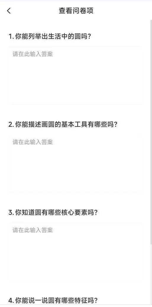学生在国平台内提交调查问卷后,教师收集数据后制作成学情报告分析,清晰呈现三类关键信息:一是学生已有认知水平,如85%的学生能准确列举生活中的圆,但仅30%能描述画圆基本工具;二是共性问题分布,如“画圆时圆心不固定”“半径长度随意调整”等“画圆不规范”问题占比78%;三是个性化疑问,如“圆为什么没有角”“井盖为什么设计成圆形”等。