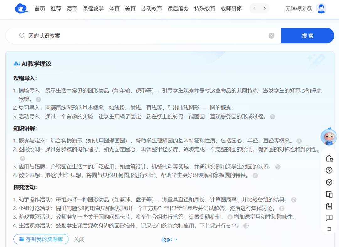 教师可使用AI智能备课助手,在国平台AI搜索输入“《圆的认识》教案”,国平台AI不仅能够提供包含教学目标、重难点和教学环节的完整教案框架,还智能推荐了“游戏竞答”以及“生活观察活动”的创新思路。