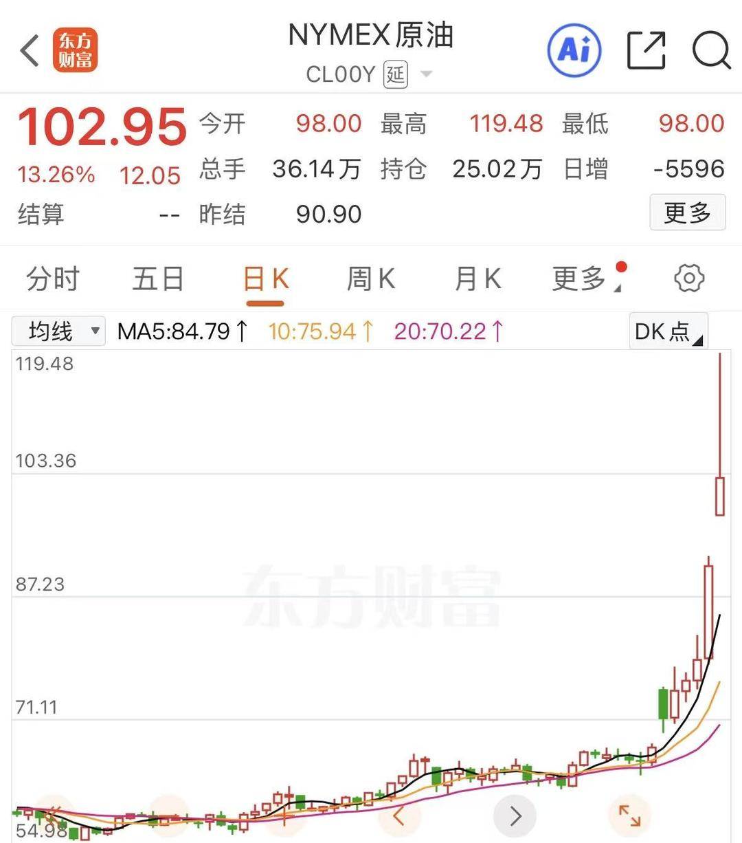 3月9日,WTI原油期货向上触及110美元/桶,截至发稿,最新报102.95美元/桶,日内上涨近13%。布伦特原油期货一度触及118美元/桶,截至发稿,最新报108.93美元/桶,日内上涨超17%。