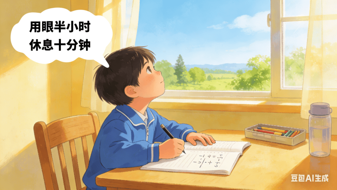 每连续读写40分钟左右要休息10分钟,可眺望远方、到室外活动,间断用眼,让眼睛得到充分放松;