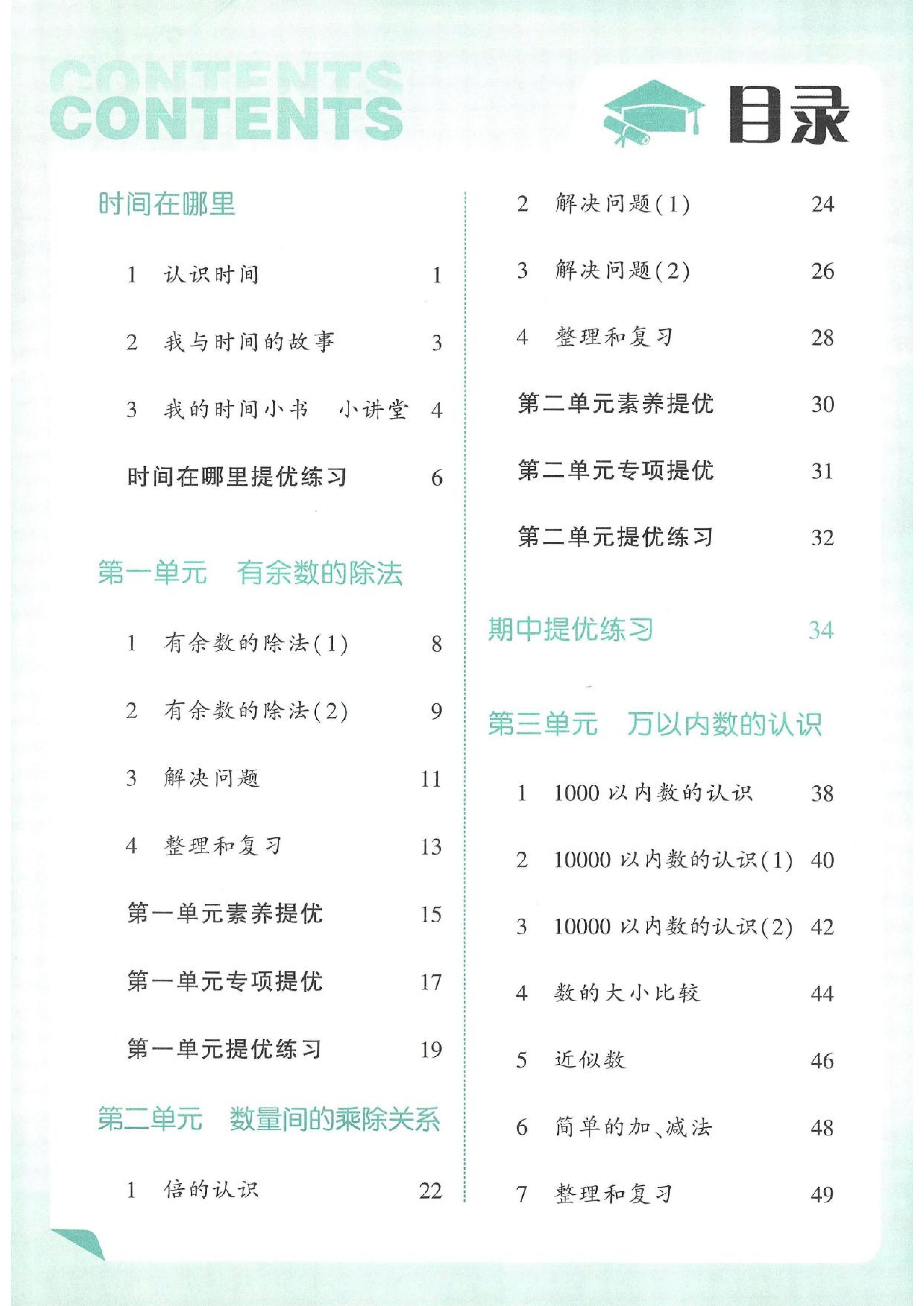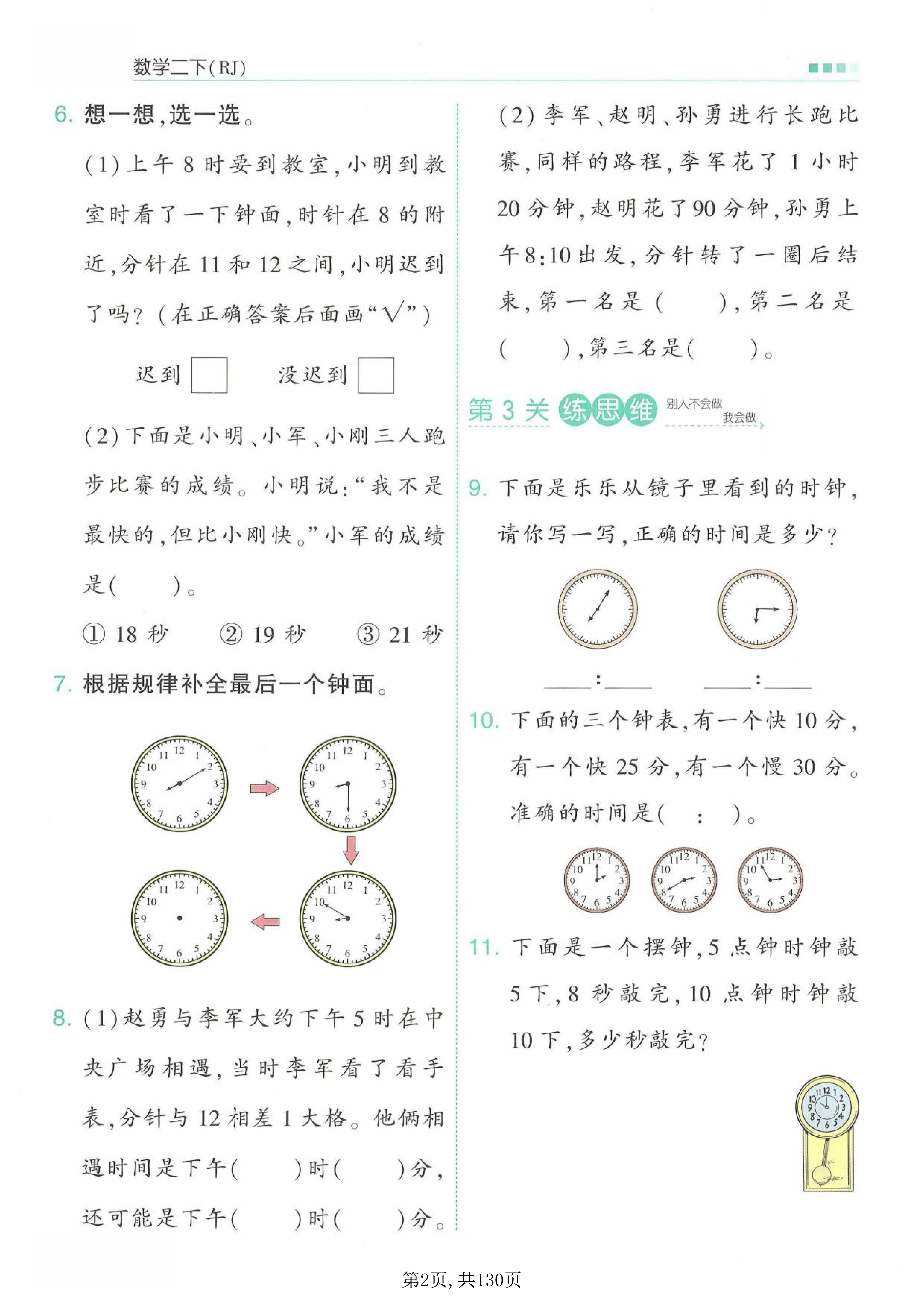 完美适配日常练习与单元复习。在 “时间在哪里” 单元,从认识钟面、时间换算到镜子里的时钟、摆钟问题,层层递进强化时间观念;在 “有余数的除法” 和 “万以内数的认识” 单元,通过基础题、提优题、专项题的组合训练,既夯实了运算基础,又提升了逻辑推理能力。这种 “分层训练 + 错题复盘” 的模式,既能高效扫清知识盲区,又能培养良好的数学思维,为二年级下册数学学习筑牢全面根基。