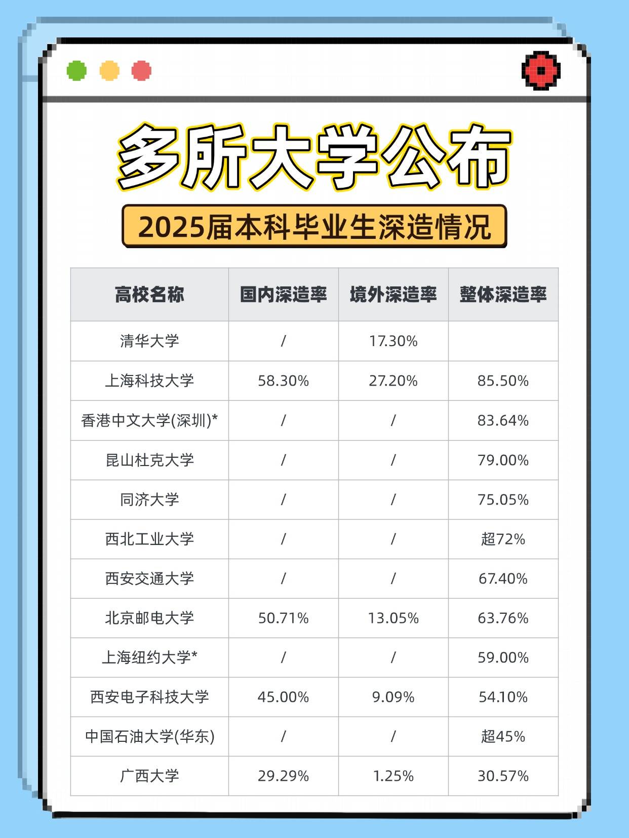 ? 数据来源于各高校新闻、2025届毕业生就业质量报告。 注:*表示为该校中国学生深造率表现。
