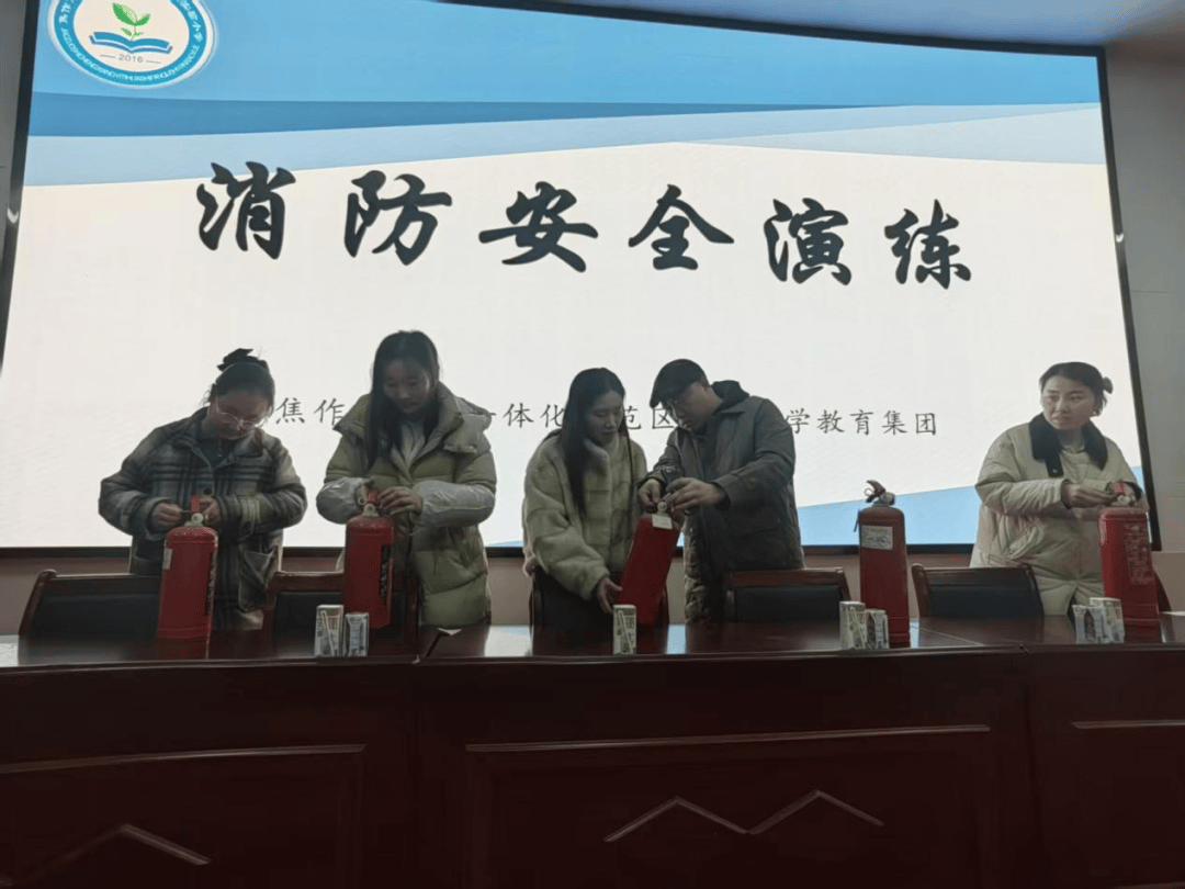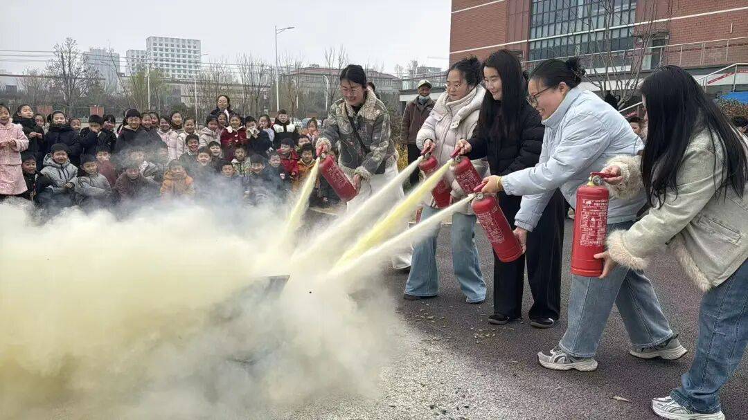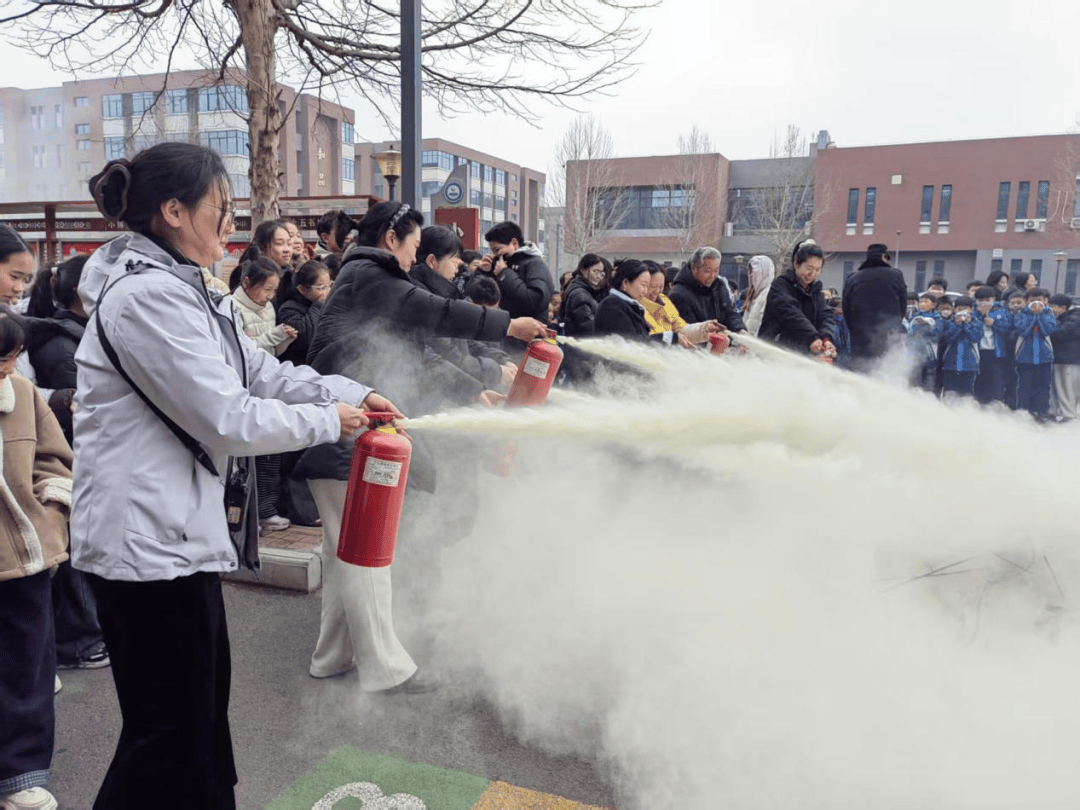 在疏散演练结束后,学校进行了消防演练。后勤保障组在划定的安全区域内,点燃了模拟火点。面对熊熊燃烧的火焰,学校教职工纷纷上阵,在抢险救护组的指导下正确使用消防设备灭火,现场秩序井然。