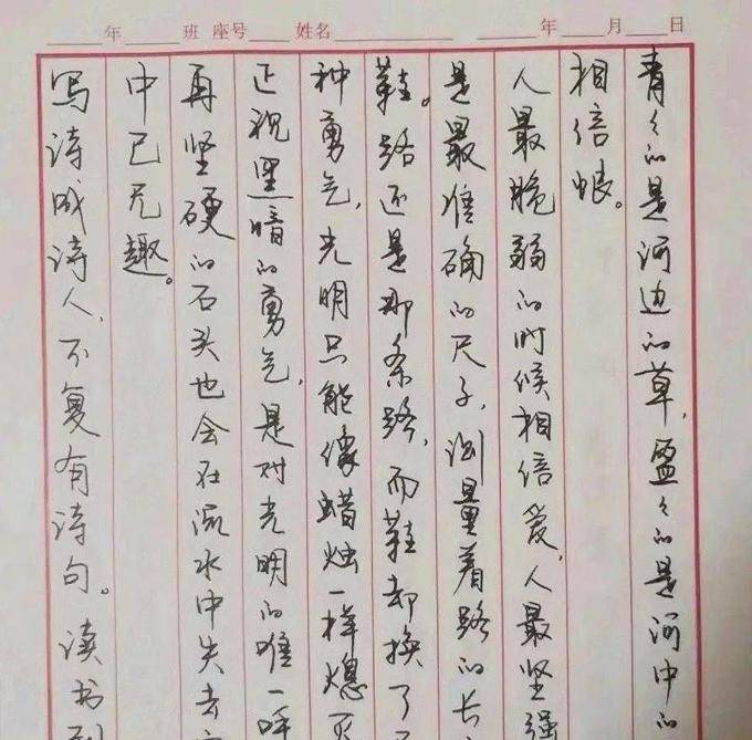 在上个学期,我们 的学校开 设了 一个 名为“功能书写课” 的课程。如果不 是为了让书写看 起来更吸引人, 那么就 需要练 习以下三 个方面: 确保字底 有横线、标点 符号需要单独 使用、 以及像“赠 送” 和“歌唱”这 样的干词 题目,前30 个字 必须出现。 经过两周 的练习, 我的模 拟考 试分 数从13 上升到 了18。 并不是 我的字 迹变 得更加美观, 而是老师 立刻注意到了我 想要写 的内容。 在北京 的一所重点中学 进行试点 之后, 试卷 的合格率 上升了41% 。他们 的老师 表示:“ 问题不 在于学生不 懂如何写 作, 而是 之前没 有人告诉他们,清 晰的文字比深 入的文字还 要重要。”