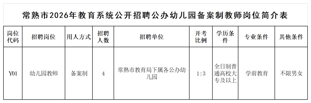 为适应我市幼教事业发展需要,满足公办幼儿园教育教学发展需求,根据《常熟市公办幼儿园备案制教师管理实施意见(试行)》,经研究, 2026年常熟市教育系统决定面向社会公开招聘公办幼儿园备案制教师4名。现将有关事项公布如下: