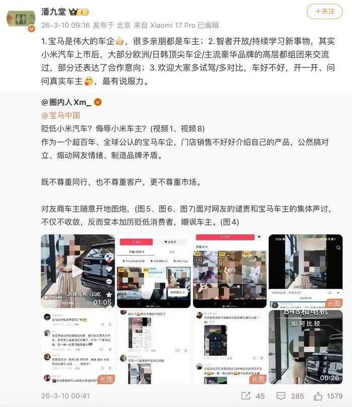 3月10日凌晨,一名博主发文称上海一宝马门店销售主播疑似在直播中贬低小米汽车、嘲讽小米车主。