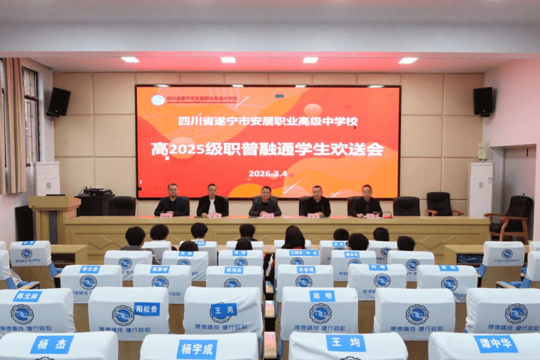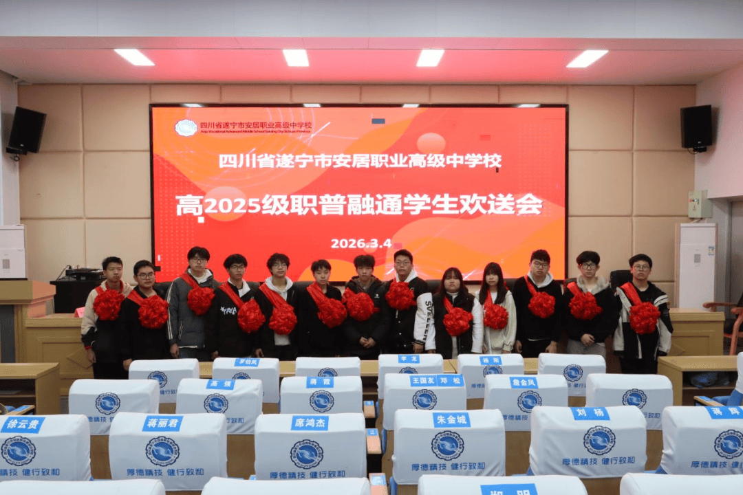 三月春光暖,学子启新程。3月4日,安居职中为14名2025级职普融通班学生举行了隆重的欢送仪式。从本学期开始,他们将分别进入安居中学、拦江中学、西眉中学高中部学习,奔赴新的逐梦征程。