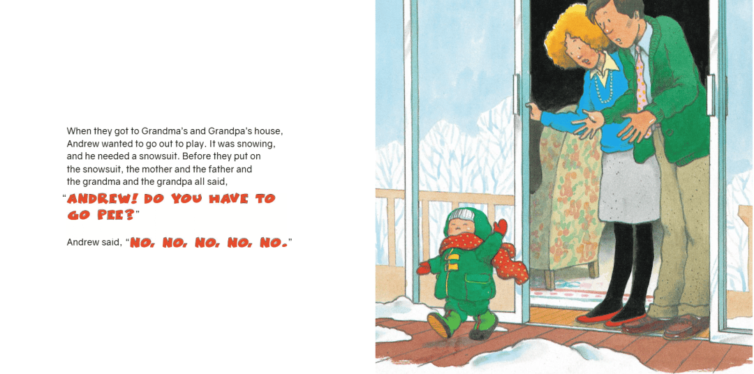 等他们到了爷爷奶奶家,Andrew又想出去玩了。外面在下雪,他需要穿上雪地服。在给他穿雪地服之前,妈妈、爸爸、爷爷、奶奶一起问:“ANDREW!你要不要先上个厕所?”