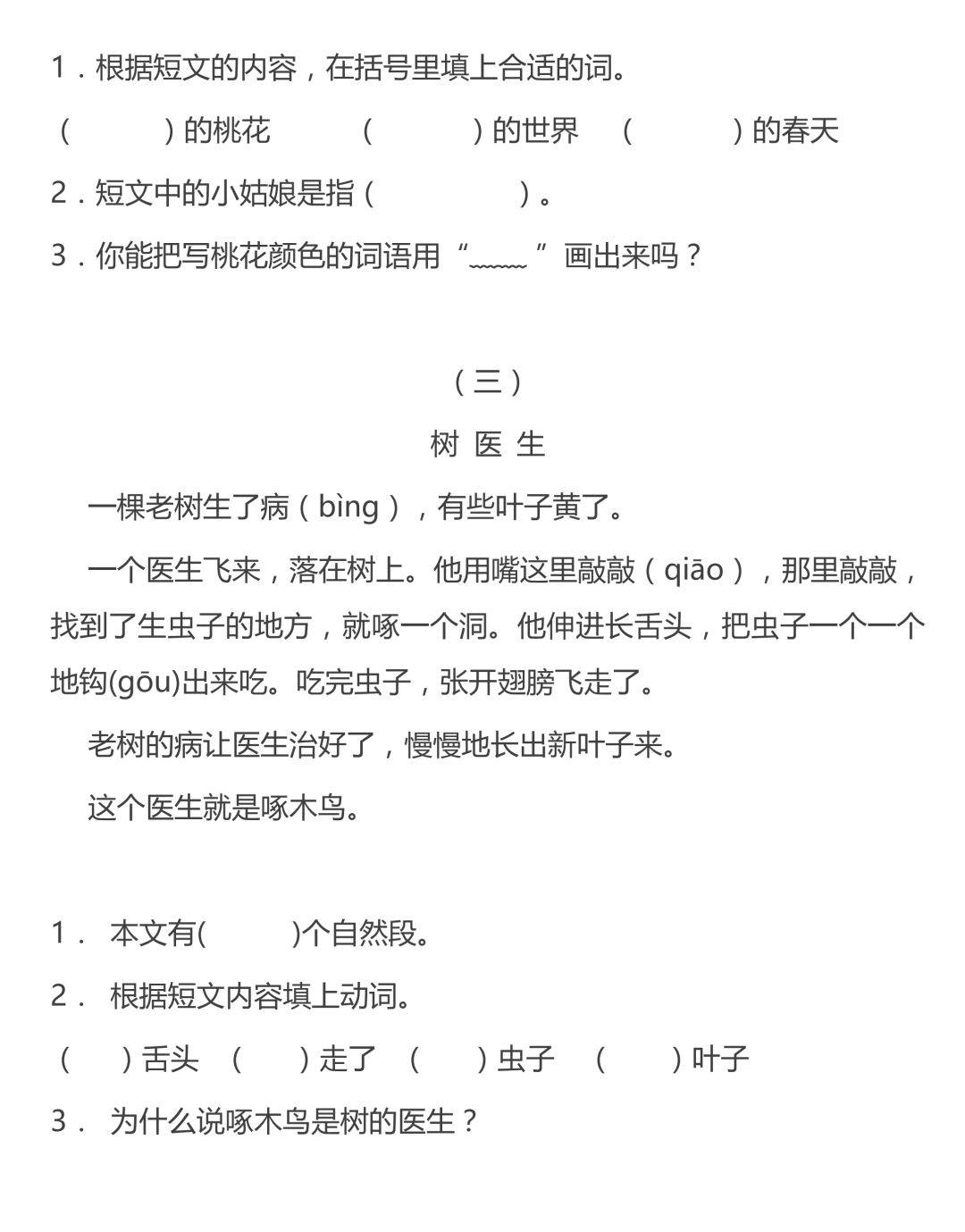 1、短文一共有( )段。第一段有( )句话。