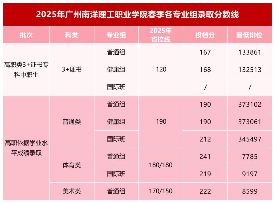 25年春季高考广州南洋理工职业学院最低录取分数线如下