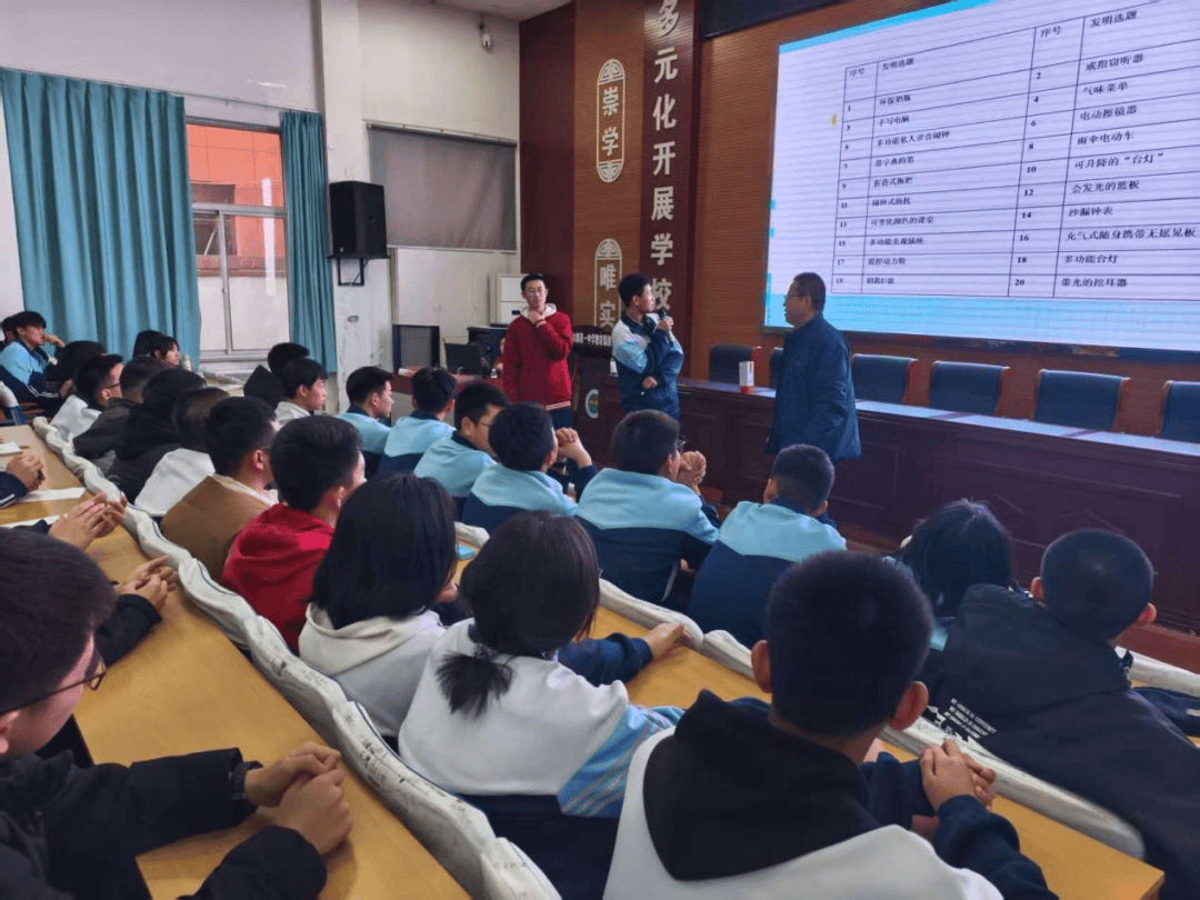 讲座以“创新思维和创新方法”为题,涵盖了青少年科创比赛获奖作品解析、科学探究方法以及前沿科技动态等多个方面内容。为让同学们更好地理解抽象的科学知识,史若辉老师精心准备了生动的视频演示,将复杂的科技原理直观地呈现出来。同时,他还巧妙地运用问题探究的方式,引导同学们主动思考,激发他们的好奇心和求知欲。现场设计的趣味互动环节更是将气氛推向了高潮,同学们积极举手、踊跃发言,纷纷参与到问答与实操中,在轻松愉快的氛围中汲取科学知识,拓宽了科创视野。