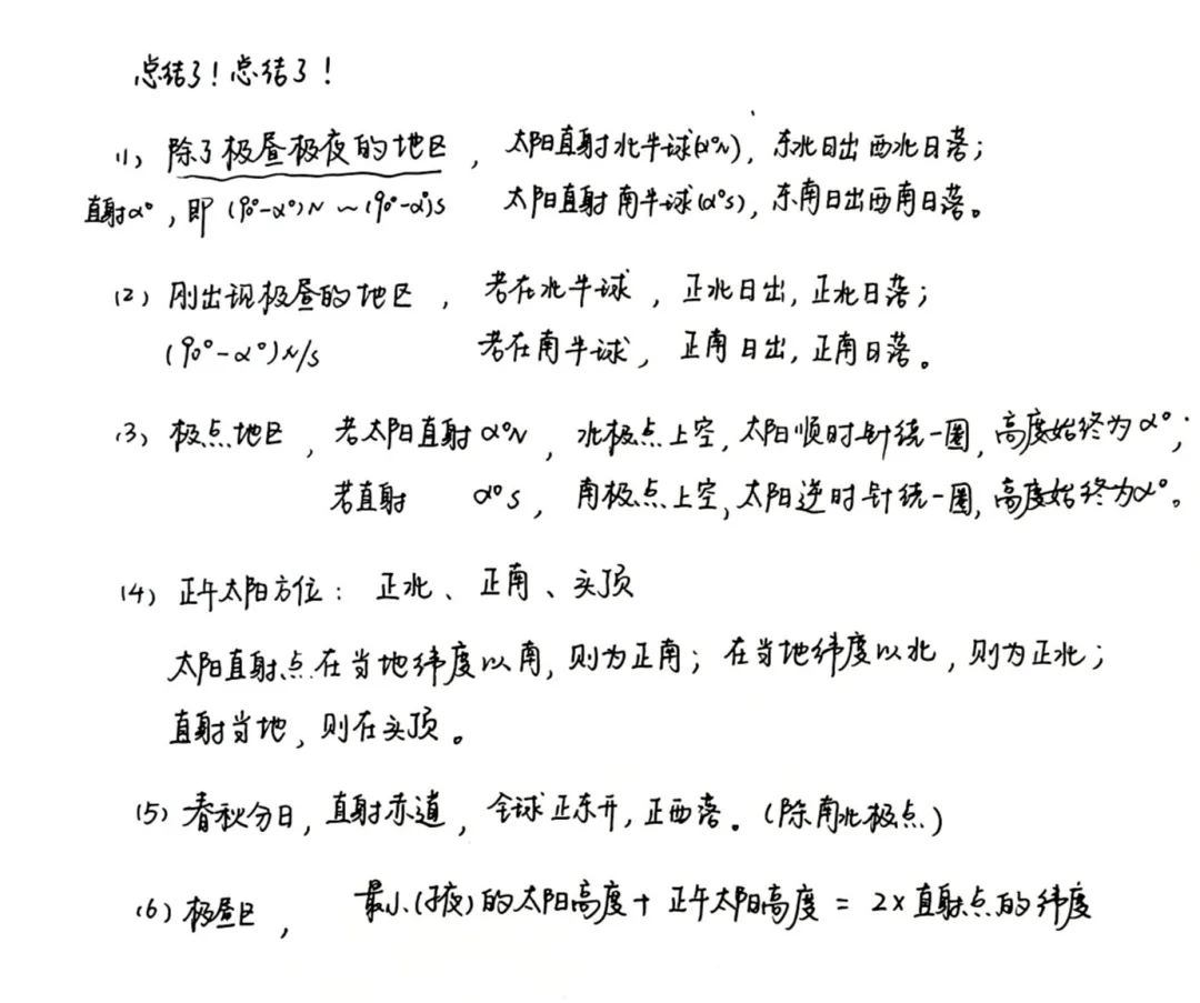 1. 已知日期、时间求方位:先判断太阳直射点所在半球,确定日出日落大致方向,再结合上下午判断具体方位。
